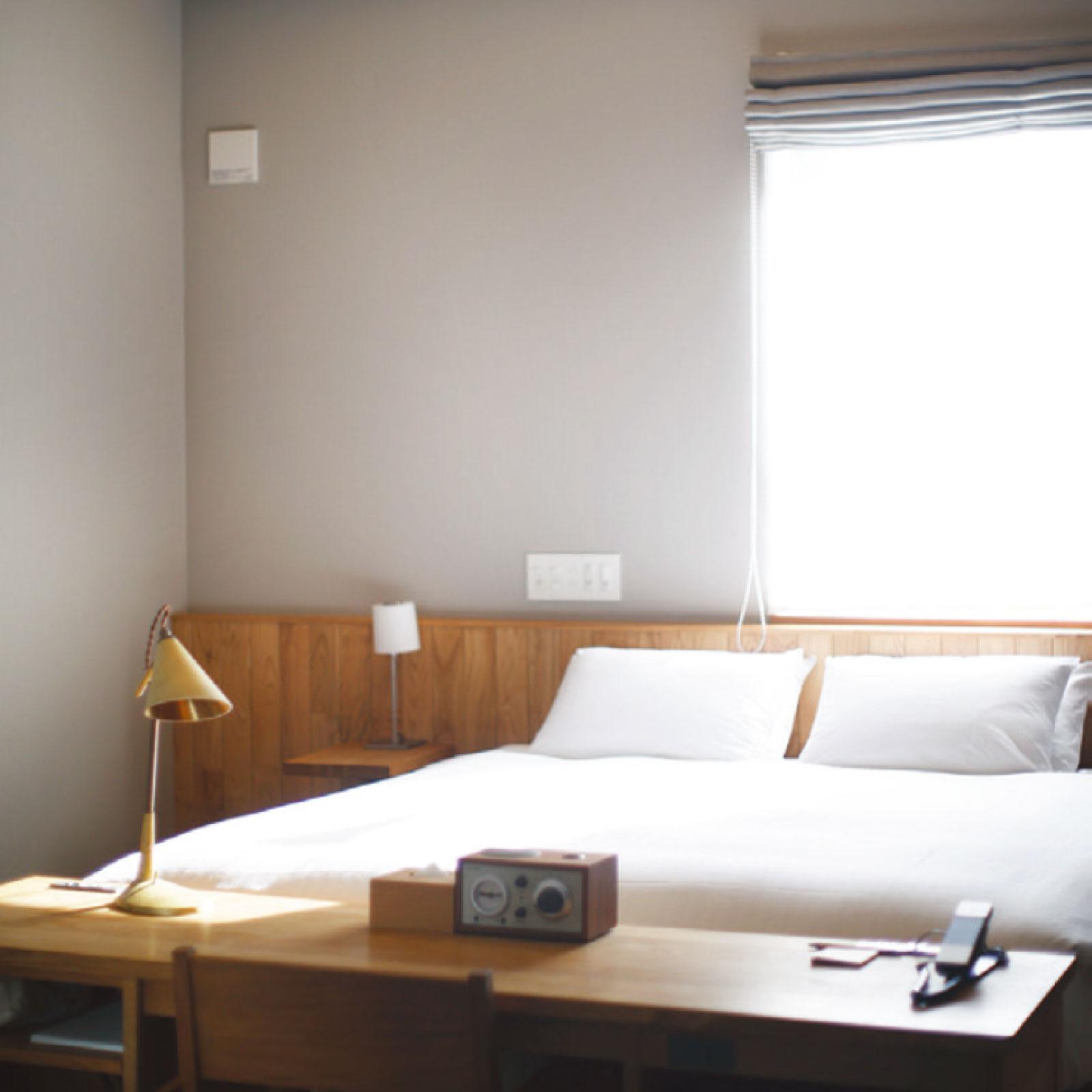 益田市に生まれ育ちデザイナーとしても活躍するオーナーの視点が、空間から運営に至るまで貫かれたホテル。ホテル地下の源泉から直接汲み出された温泉やサウナが完備され、シンプルながら木の温かさがある客室は、靴を脱いで過ごせる心地よさが自慢。