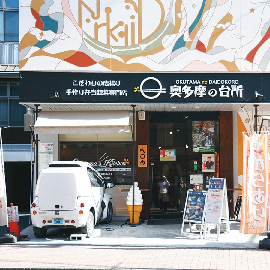 奥多摩駅のすぐ近くにあるお弁当&お惣菜屋さん。さまざまなメニューが並びますが、3月から11月までのイチオシは、1日15食限定の〈天空の奥多摩やまめ弁当〉。奥多摩で育った魚・やまめの唐揚げとすり身揚げがどーんとのった、ボリュームたっぷりのお弁当。
