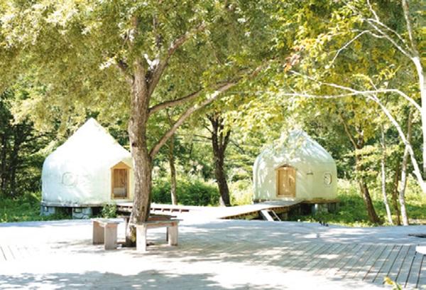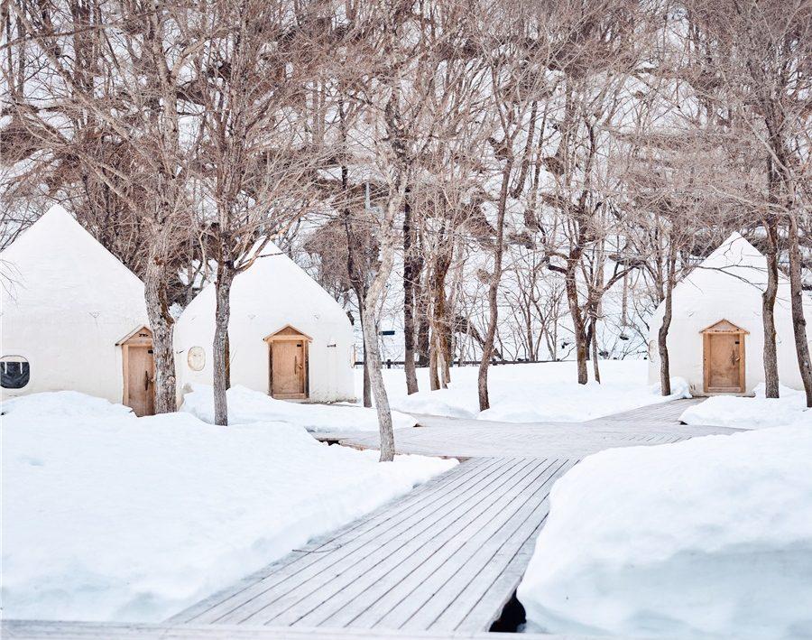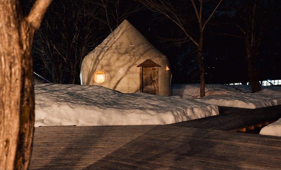宿は駅直結なので移動も楽チン。GUEST ONLYの扉を開けてデッキを進むと、なんとも可愛いメレンゲのようなインスタントハウスが顔を出す。こう見えて実は災害地での仮設住宅用に開発された優れもので、中はほっかほか。