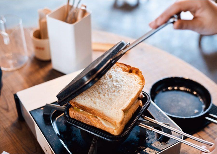 「DOAI VILLAGE」の朝ごはんは手作りホットサンド! 県内産ベーコン&目玉焼きにレタス、チーズをのせて…。焼けるのを待っている間には、オリジナルブレンドのコーヒーを、豆を挽くところからやってみよう。