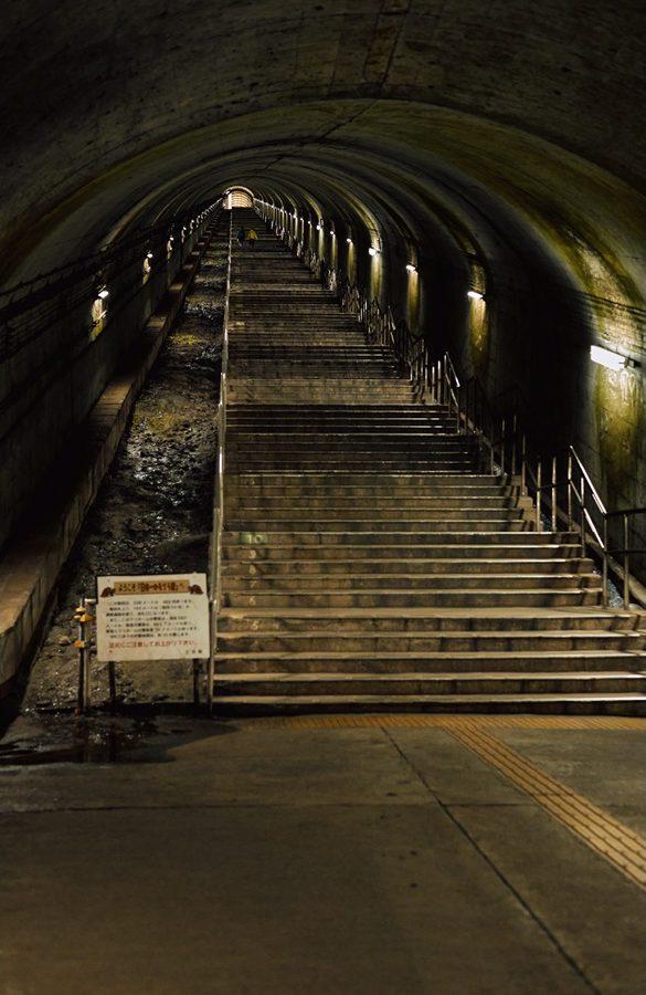 先ほどまでの銀世界はいずこ、突如現れる気が遠くなる階段は、338m、462段。ゲーム世界か、はたまたSFか。“モグラ駅”の名を納得せざるを得ない重厚感に包まれ、電車が近づくにつれ、ゴゴゴ…と風と機械音が鳴り響く。