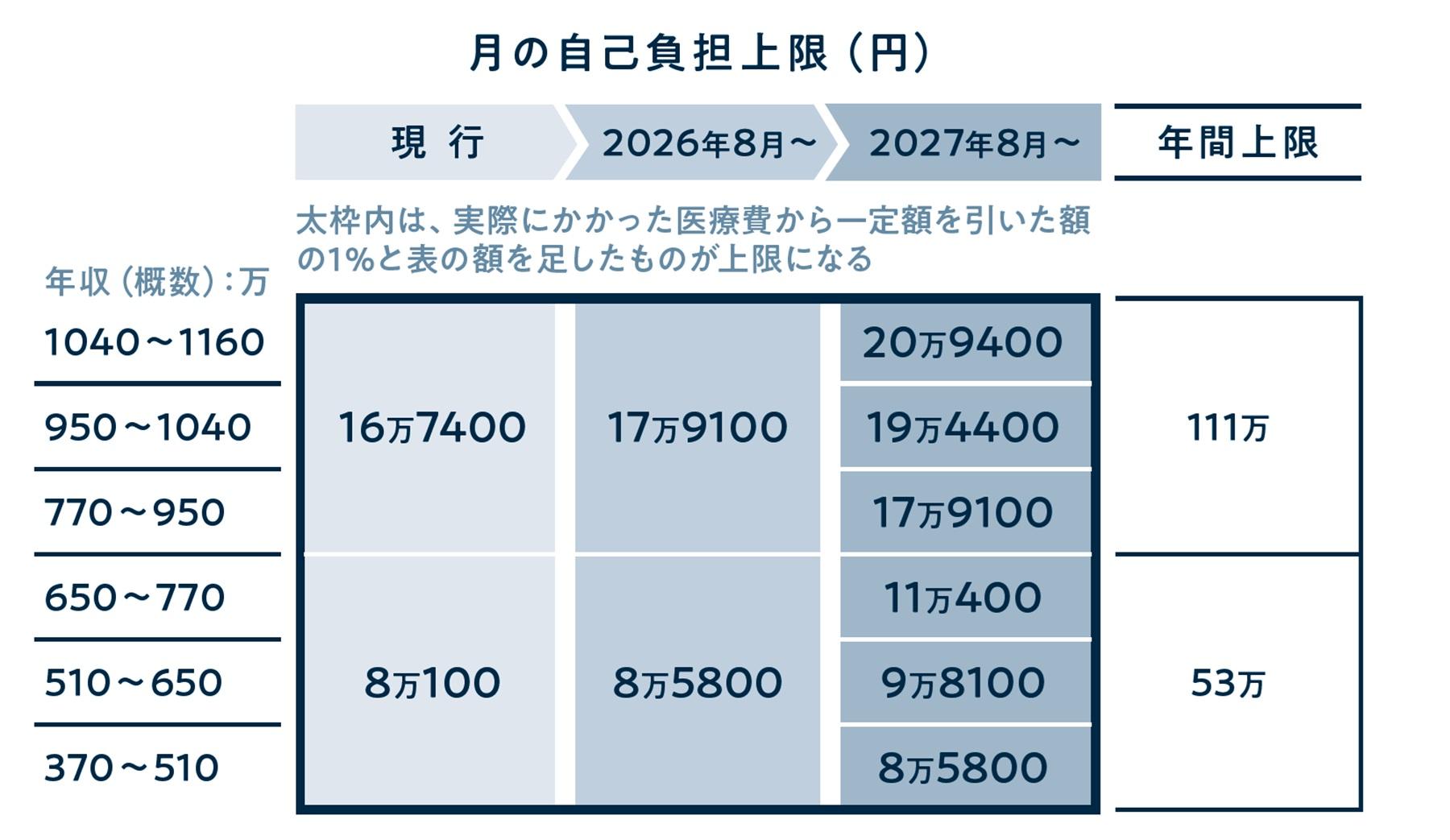 所得区分に応じて、自己負担上限額が月額7~38%引き上げ(住民税非課税世帯を除く)。たとえば年収約370万~770万円の層は、1か月の医療費上限が約8万円から約8万6000円へ。
