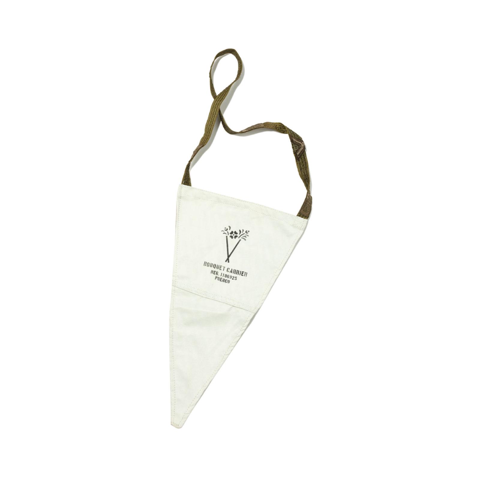 花束の持ち運びに便利なケースは、ユーズドのスノージャケットを解体し再構築したもの。あえて傷やほつれ、汚れを残したラフな風合いが『PUEBCO』らしい表情。W28×H50cm ¥2,750(プエブコ TEL. 090-9140-0579)