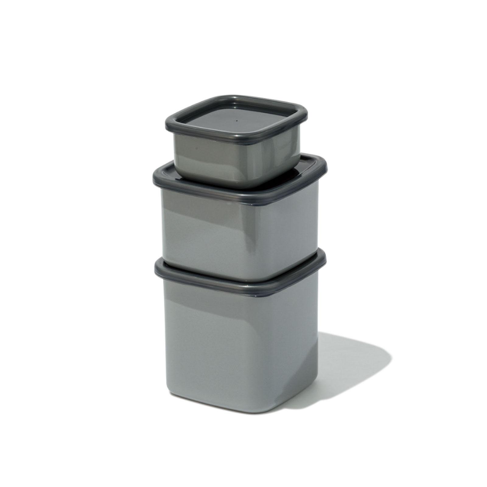 保冷効果に優れ、ニオイ移りしにくい琺瑯の保存容器。+Grayスクウェアシール蓋付、S・W10.6×D10×H5.4cm ¥1,375 M・W12.4×D12.4×H8.4cm ¥2,035 L・W12.4×D12.4×H11.8cm ¥2,310(野田琺瑯