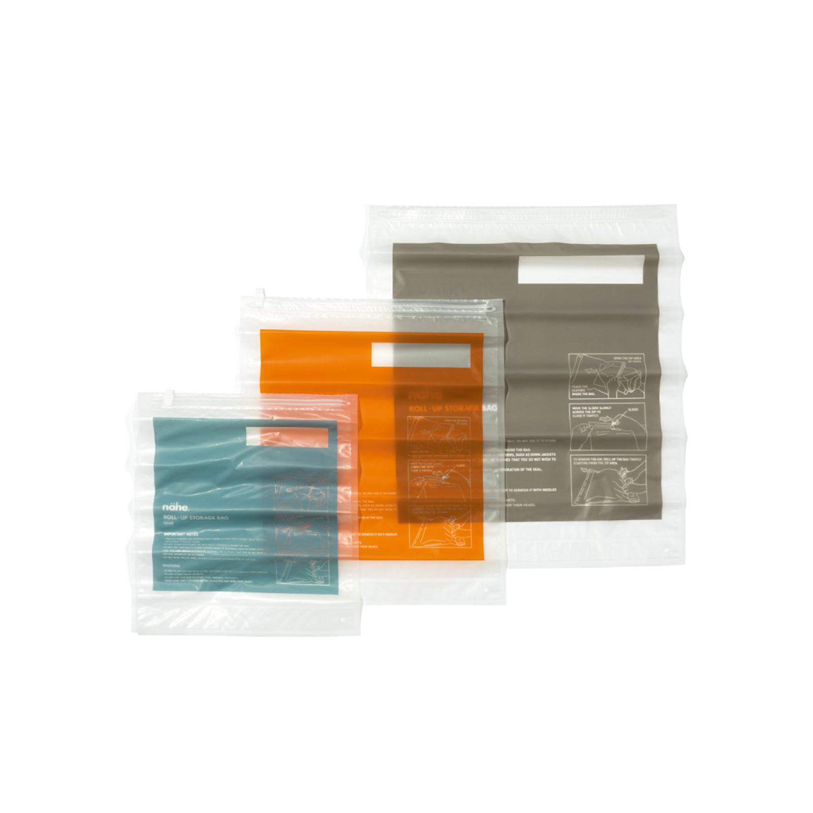洋服を入れチャックを閉じ、くるくる折り畳んで空気を出すだけ。ロールアップストレージバッグ 各3枚入り、S・W35×H40×0.2cm ¥770 M・W42×H50×0.2cm ¥880 L・W50×H60×0.2cm ¥990(ハイタイド