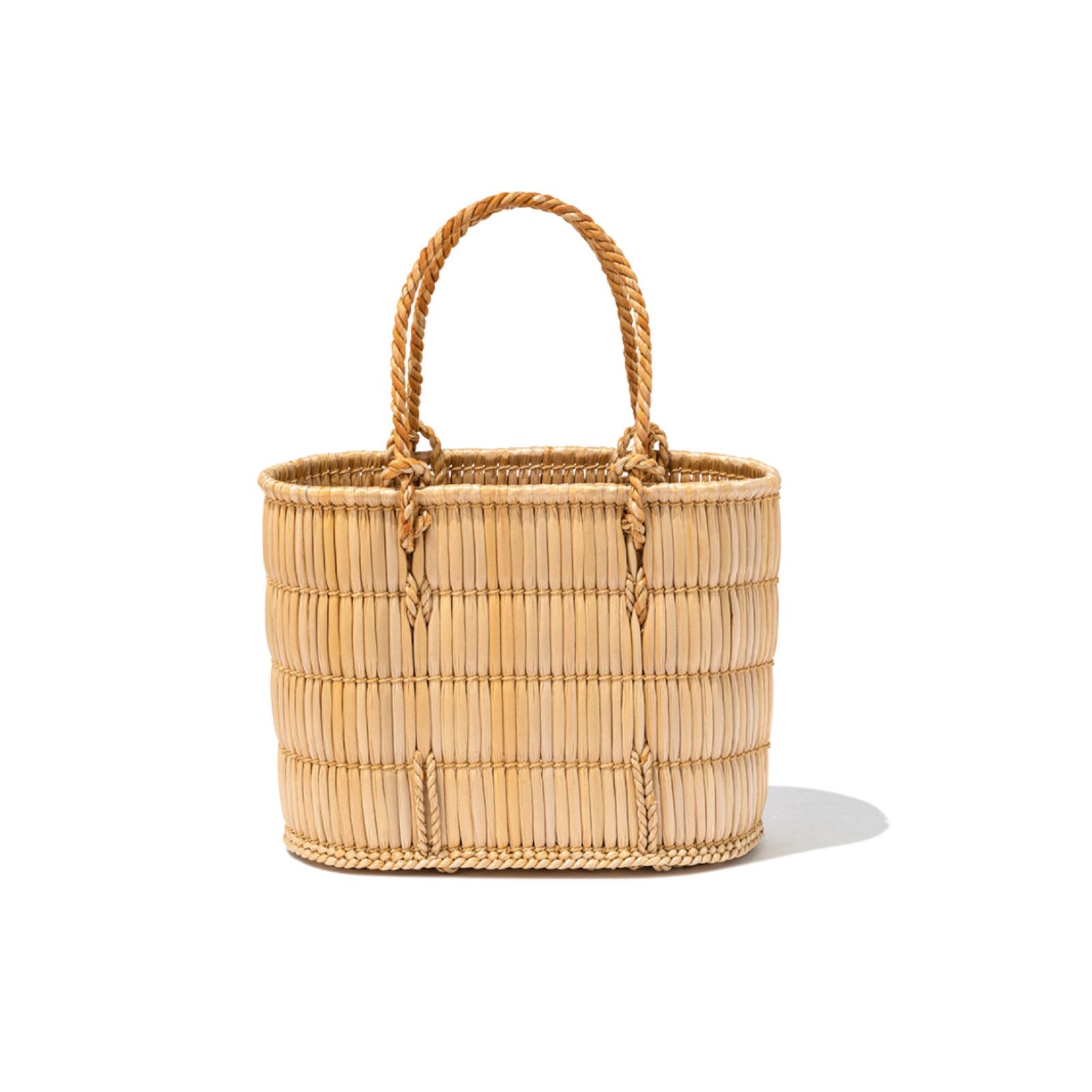 岡山県・蒜山地方に伝わる伝統工芸、がま細工のかごバッグは、軽やかな使い心地と撥水性の高さが特徴。バッグとしてはもちろん、ちょっとした小物を収納して飾っても。W26×H20×マチ14cm ¥23,100(YAECA CA JITSU TEL. 03-6810-0187)