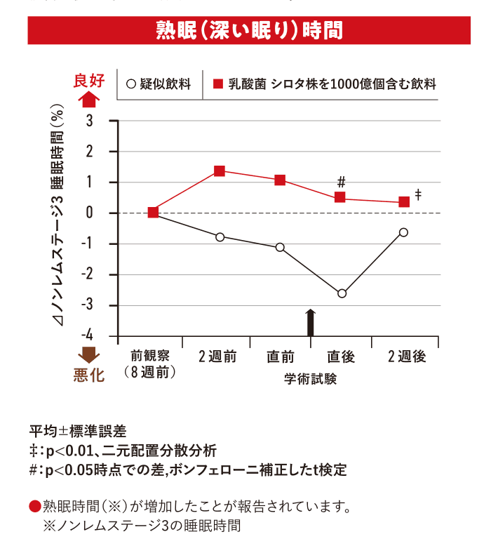 飲用試験の結果、ぐっすりと深く眠っている状態の「熟眠時間(※3)」が増加。また、眠りの深さを示す「熟眠度(※4)」の数値も高まりました。さらに、「すっきりとした目覚め」を示すスコア(※5)でも改善が認められています。