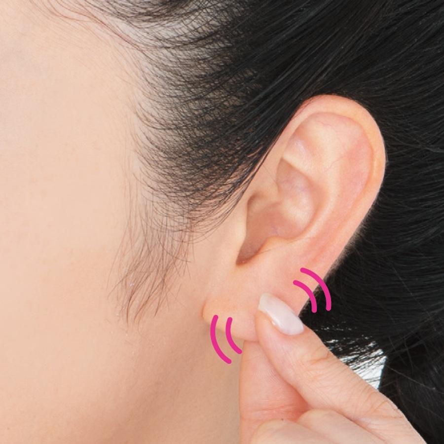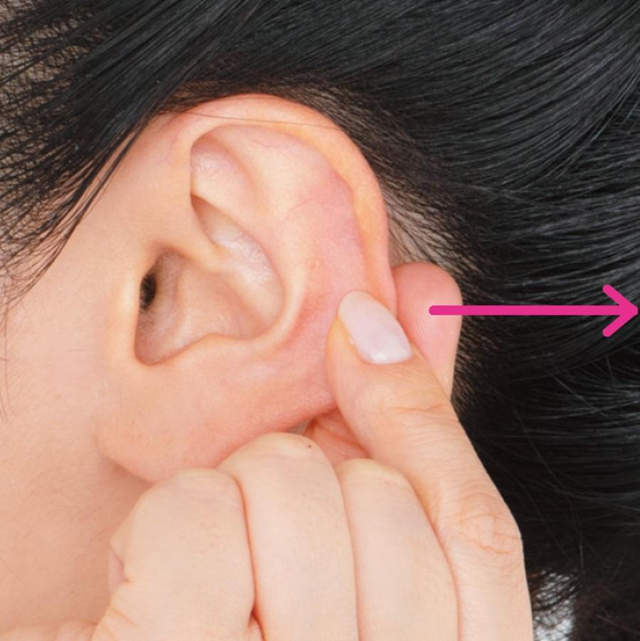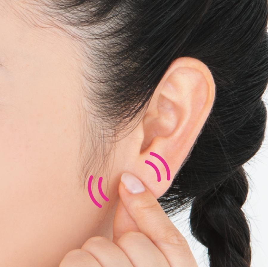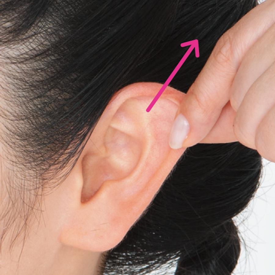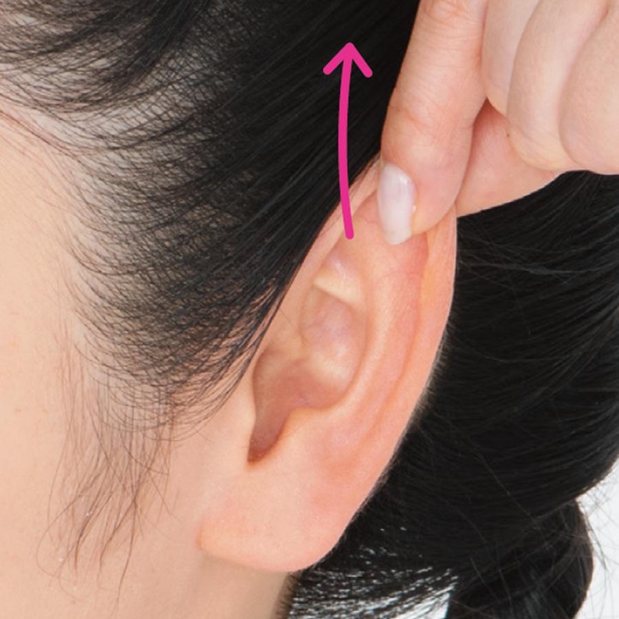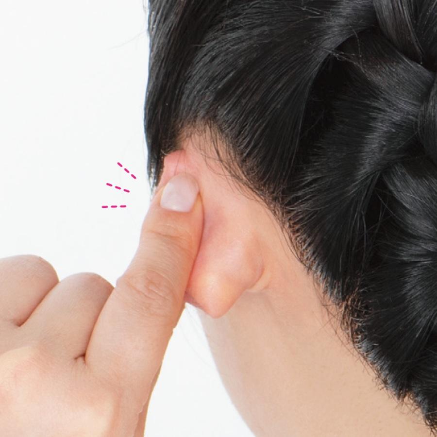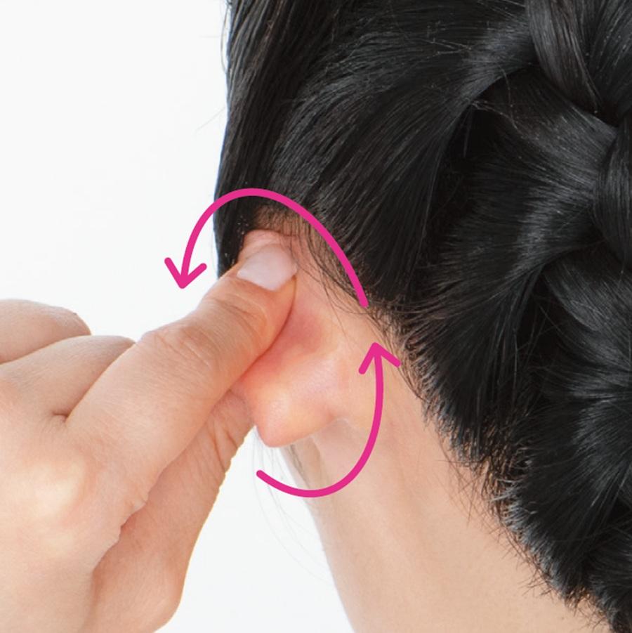2、人さし指、中指、薬指で、耳の内側を上下に10回やさしくさする。