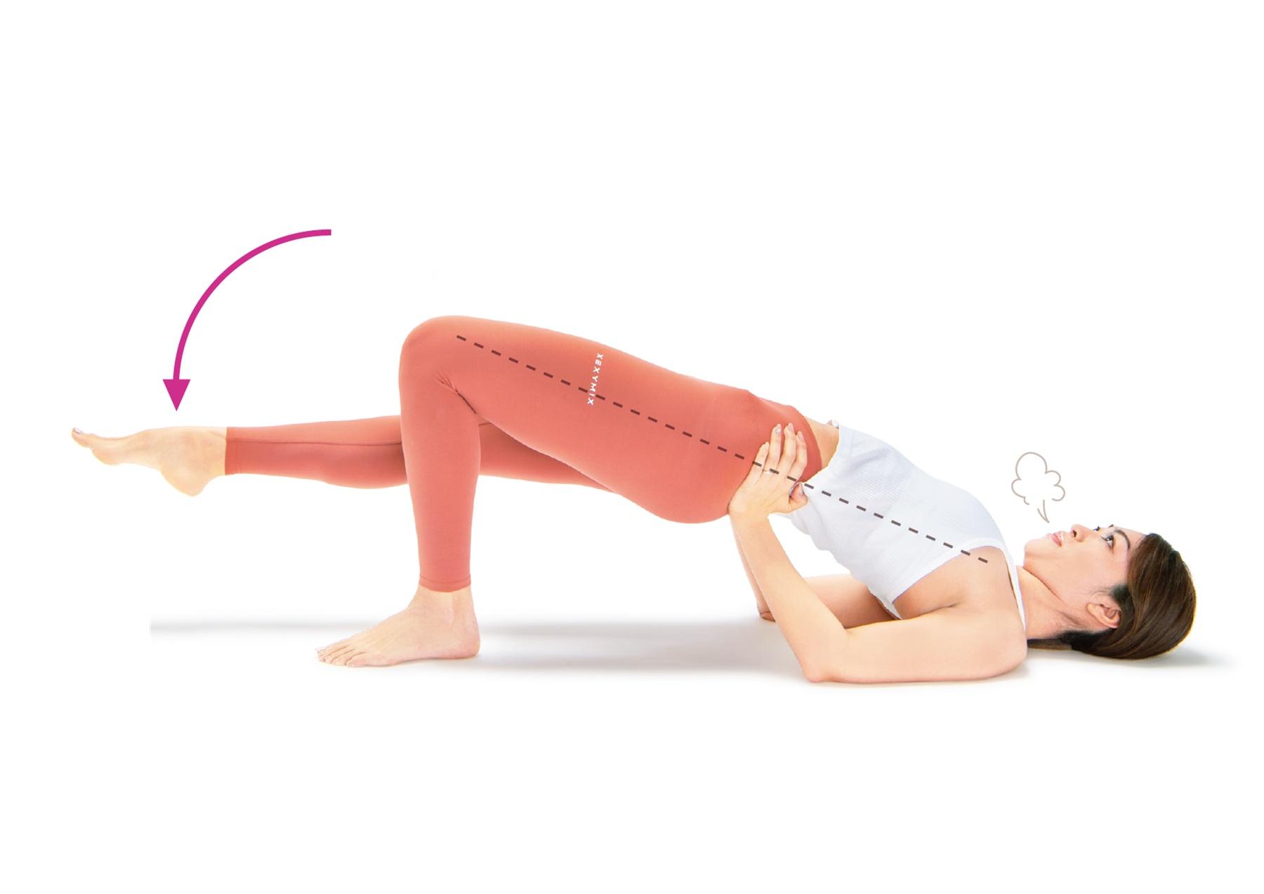 骨盤を床と平行の状態でキープしたまま、脚を交互に曲げ伸ばしするエクササイズ。脚の余分な脂肪が落とせるとともに、X脚やO脚といった骨格の歪みも整えられる。