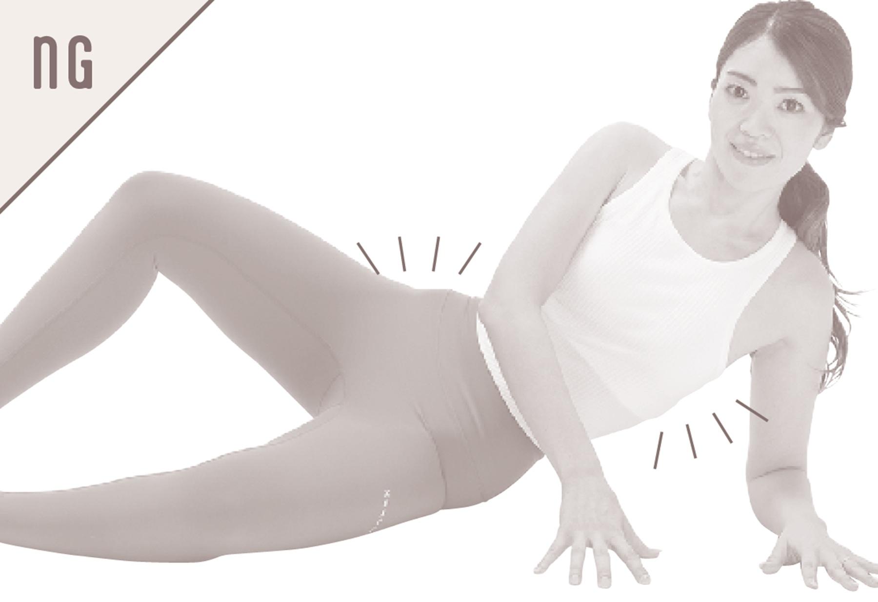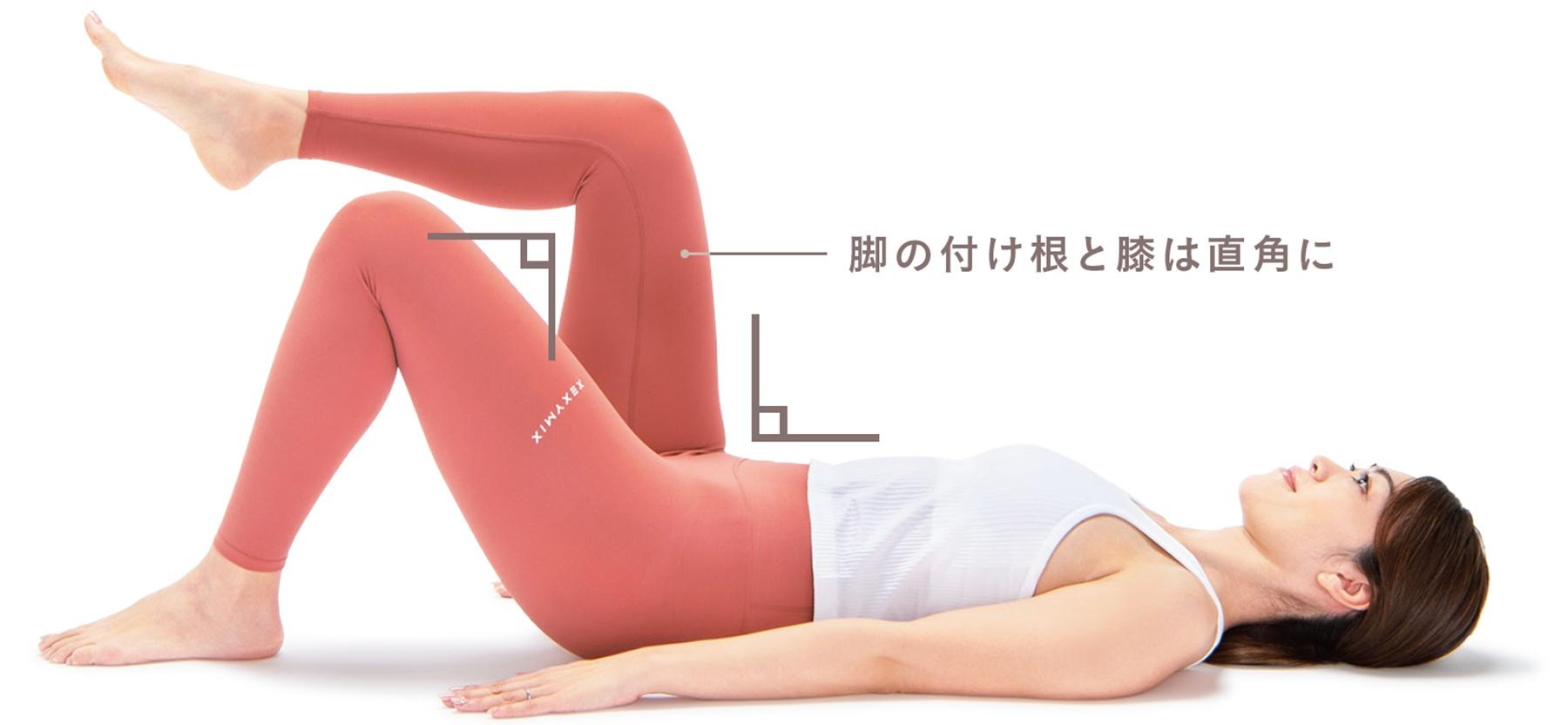 曲げた膝を上半身側に引き込みすぎないこと。それにより土台が崩れて、骨盤を床と平行に保てなくなって効果が半減。膝の角度は90度をキープしよう。