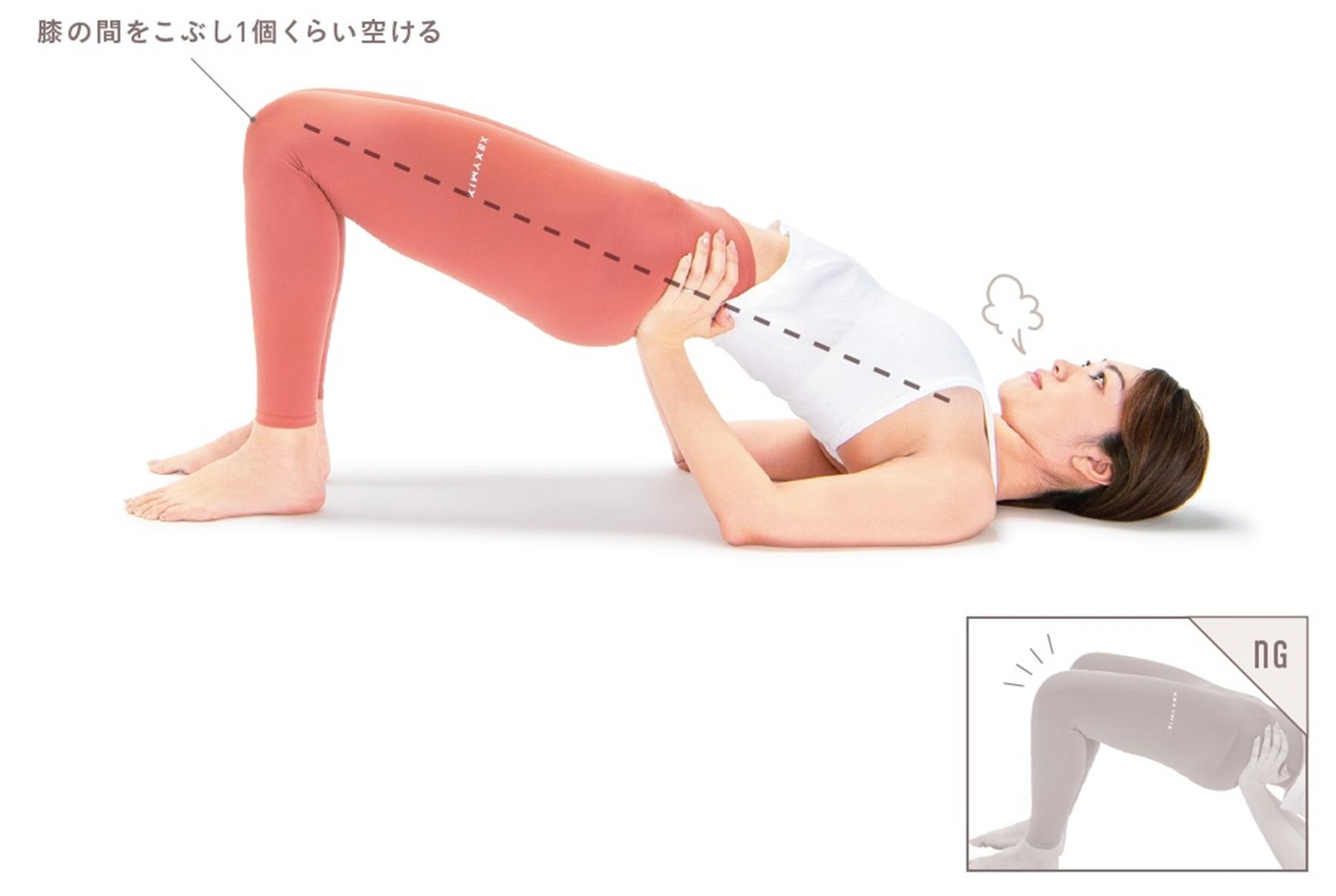 膝の力が抜けてパカッと開くと、骨盤が傾いてねじれやすくなり、内ももやお尻に効かなくなる。膝の間はこぶし1個分をキープし、お腹を引き締めて。