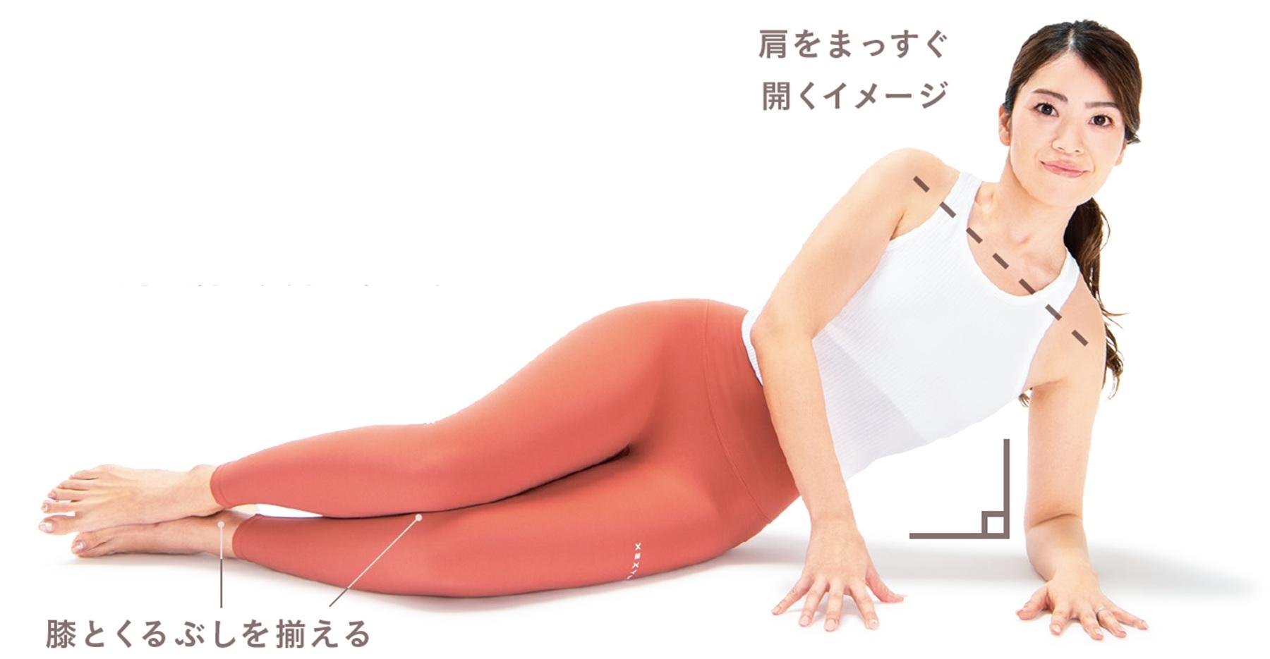 1、横向きに寝て、膝を軽く曲げる。膝とくるぶしは左右揃えること。上半身は肩がまっすぐ開くようにしながら背筋を伸ばし、下側の肘を肩の真下に置く。