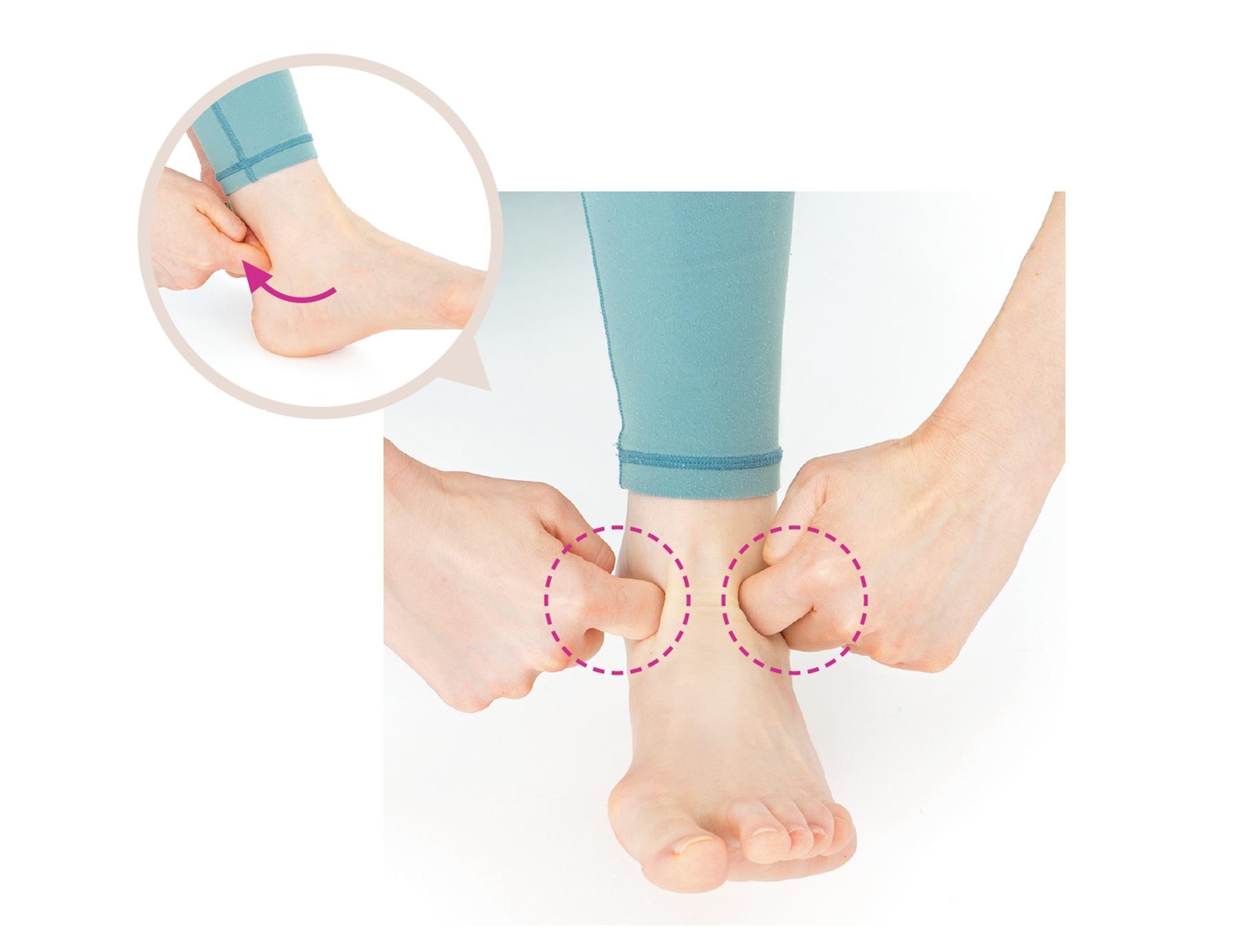 つま先を上げた時にできる足首の2つのくぼみを、人差し指の第二関節を使って、ぐりぐりと押す。10秒くらいを目安に行う。内側のくぼみが下半身リンパ、外側のくぼみが上半身リンパの反射区になっている。さらに、くるぶしの下から足首の後ろにかけて、老廃物を流すように押していく。