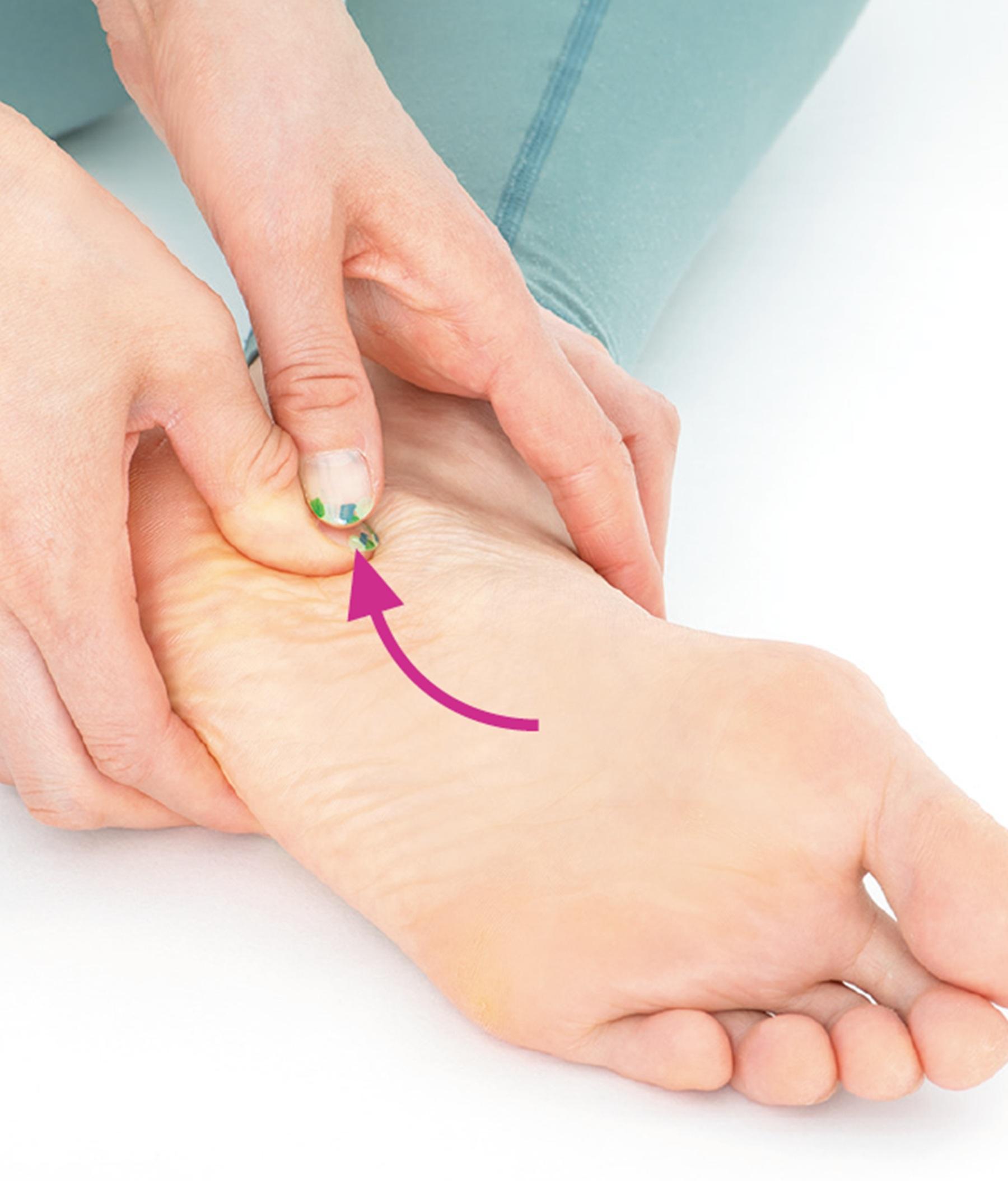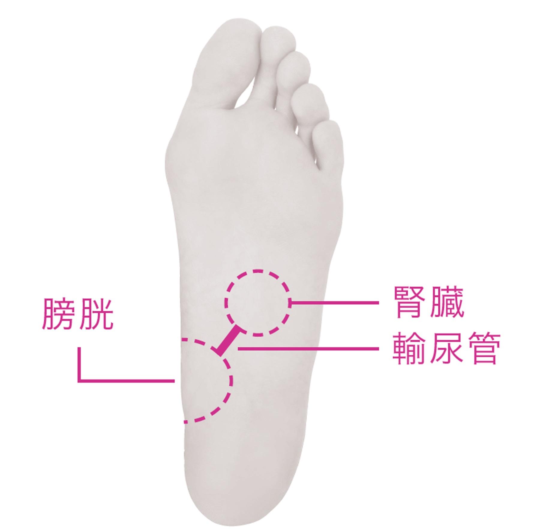 まずは足裏にある反射区にアプローチするところからスタート。腎臓、輸尿管、膀胱の反射区をしっかりと揉みほぐしていこう。