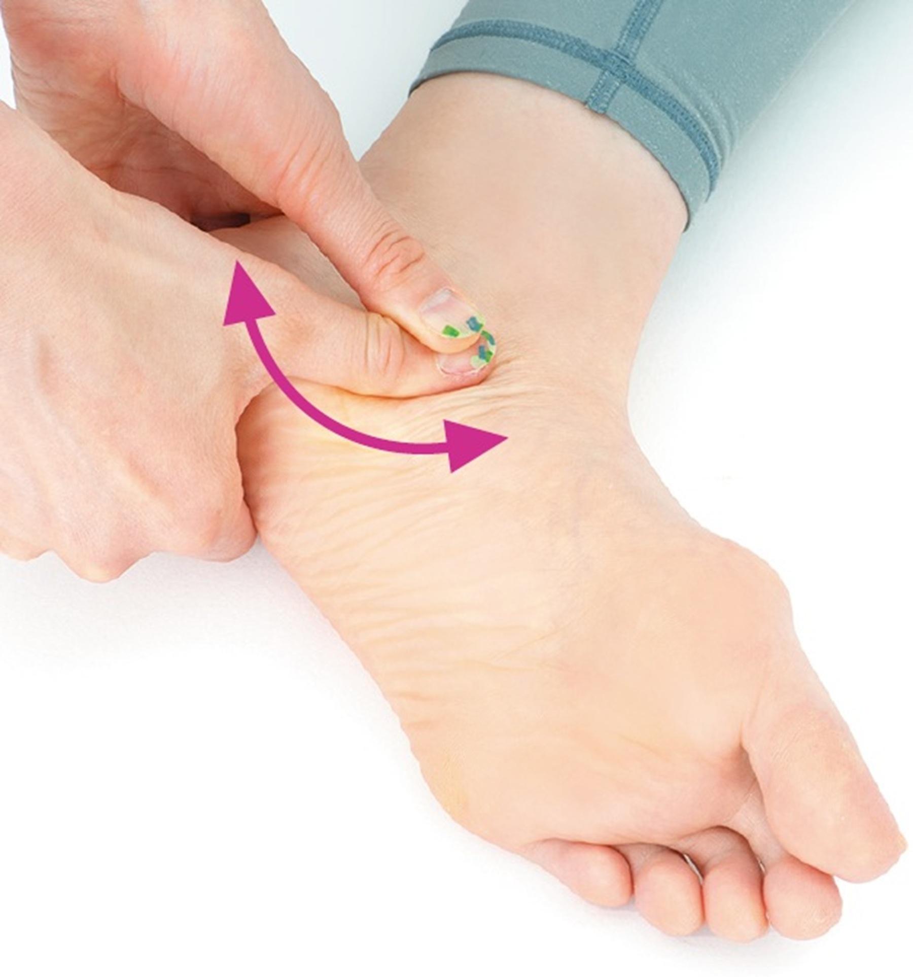 両手の親指を重ねて、土踏まずの下あたりから内くるぶし近くにある膀胱の反射区を、しっかりと揉みほぐす。反射区全体を、5往復を目安に揉んで流す。