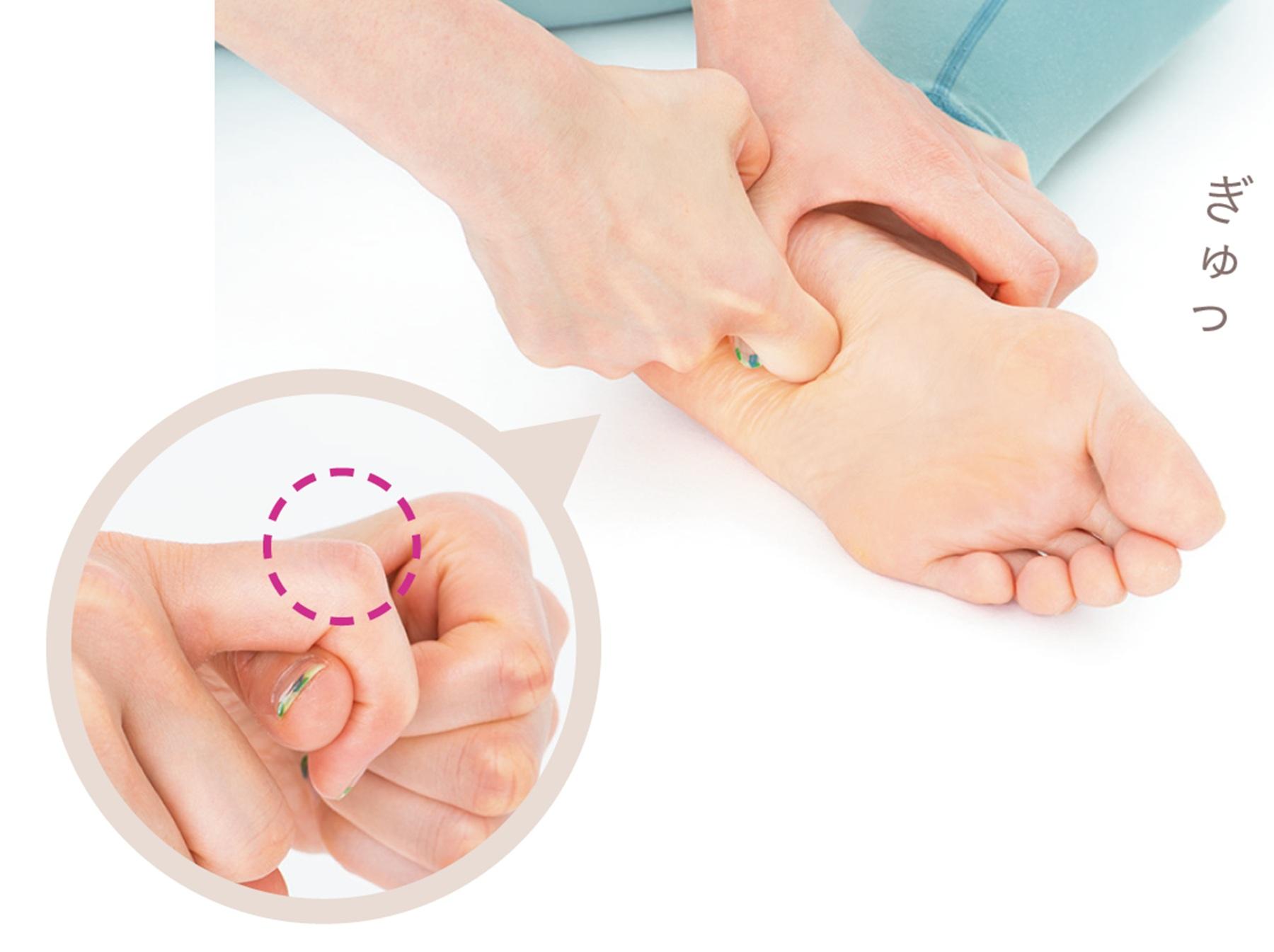 手でより奥深くまで押したいという人は、こちらの方法を試してみよう。まずは右手を握り、人差し指を出して丸い形を作る。そこに左手の親指を入れ、右手の人差し指に力を入れて固定し、人差し指の第二関節を使って揉みほぐす。