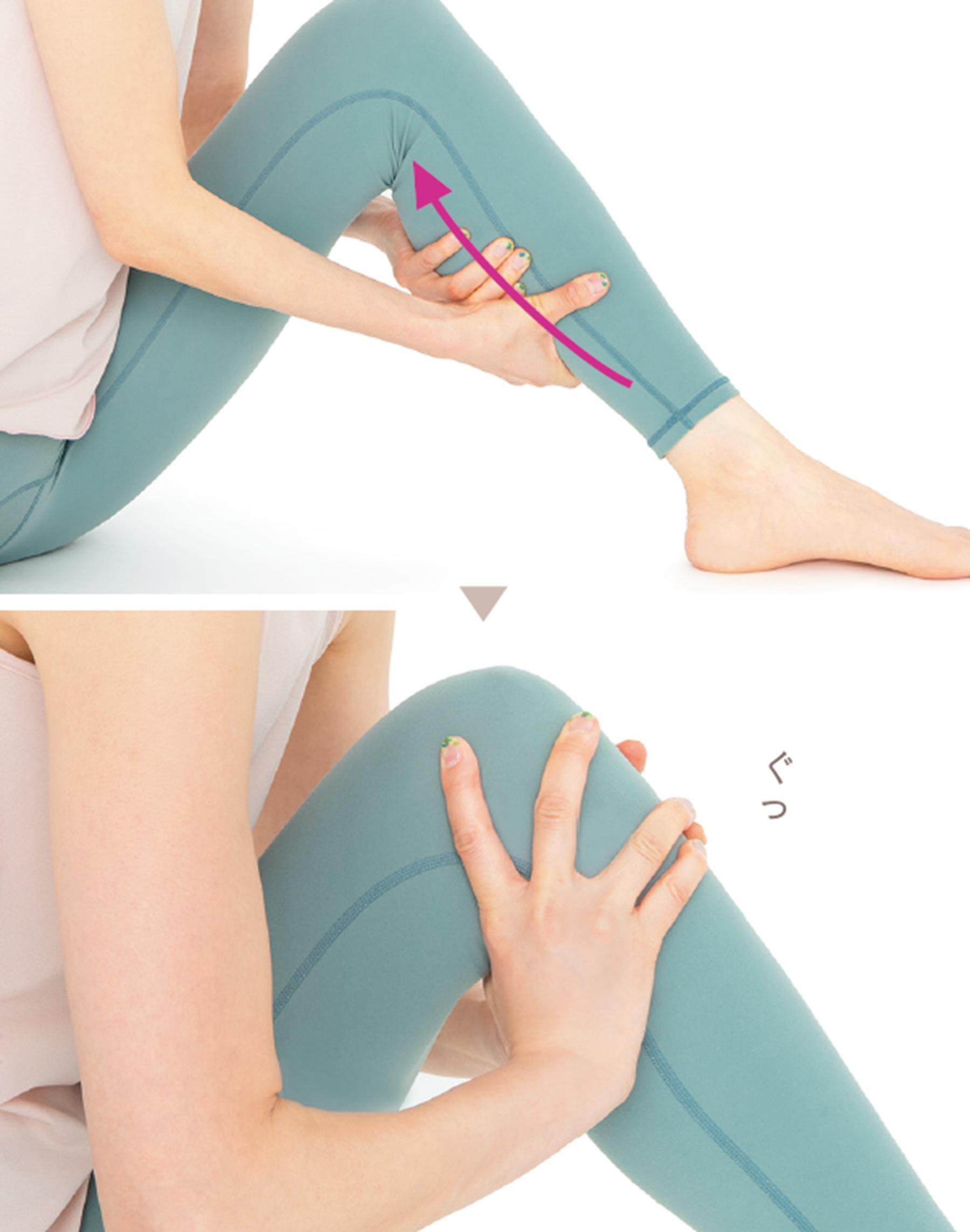 足首からふくらはぎにかけて、両手を使って下から上に揉んでいく。筋肉をほぐすようにイタ気持ちいいくらいの強さで行う。5回が目安。さらに、老廃物を流すリンパ節がある膝の裏を、両手の親指を使ってしっかりと押し、揉みほぐす。他の指で膝のあたりを掴むようにすると上手に力を入れられる。