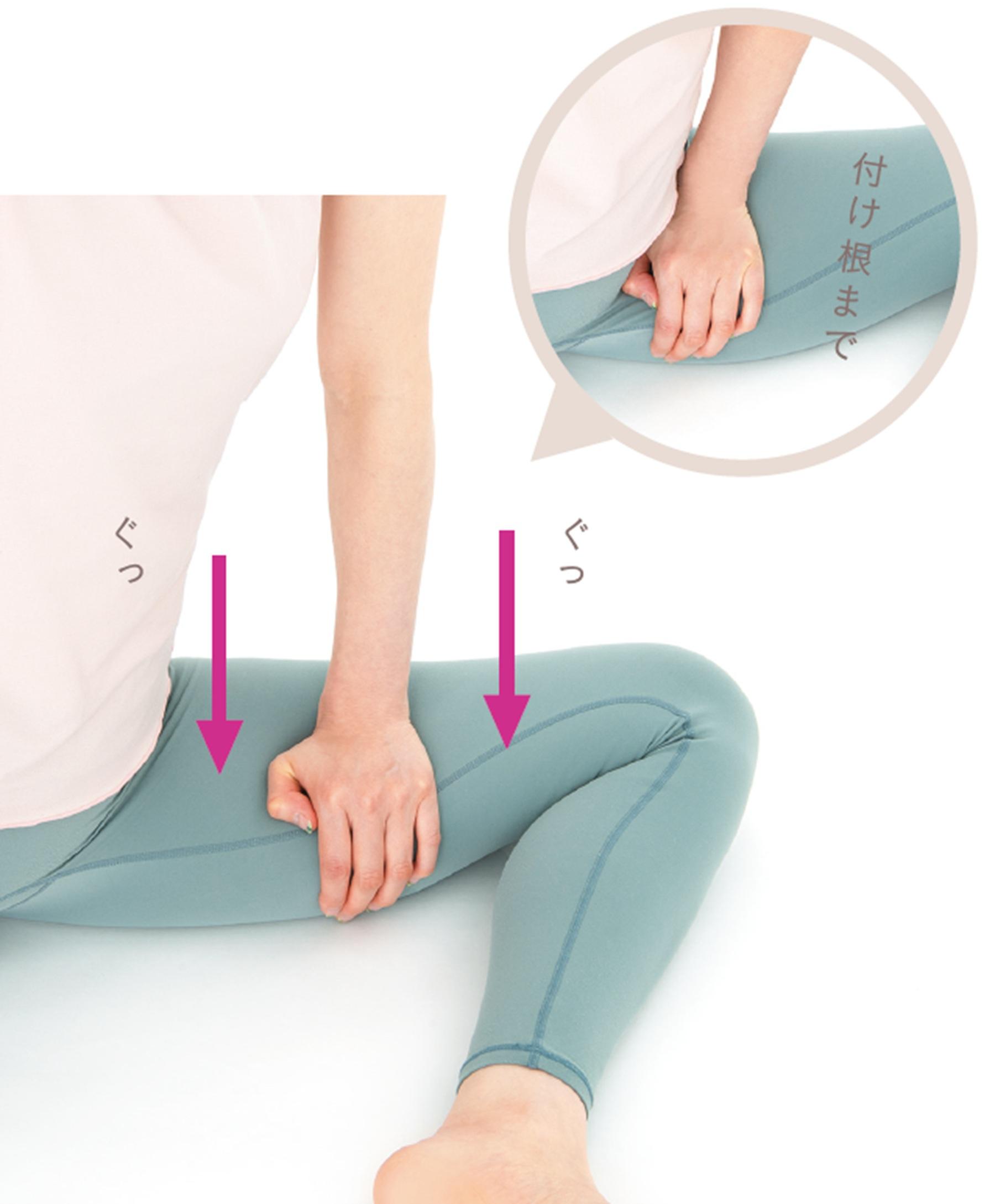 脚を外に倒して、太ももの内側を下から上へと揉みほぐす。脚の付け根までしっかりと押すことが、老廃物をきちんと流すための大事なポイントに。5回を目安に行う。手のひらを使って体重をかけるようにすると、ちょうどいい力をかけられる。1~3を反対側の脚も同様に行う。