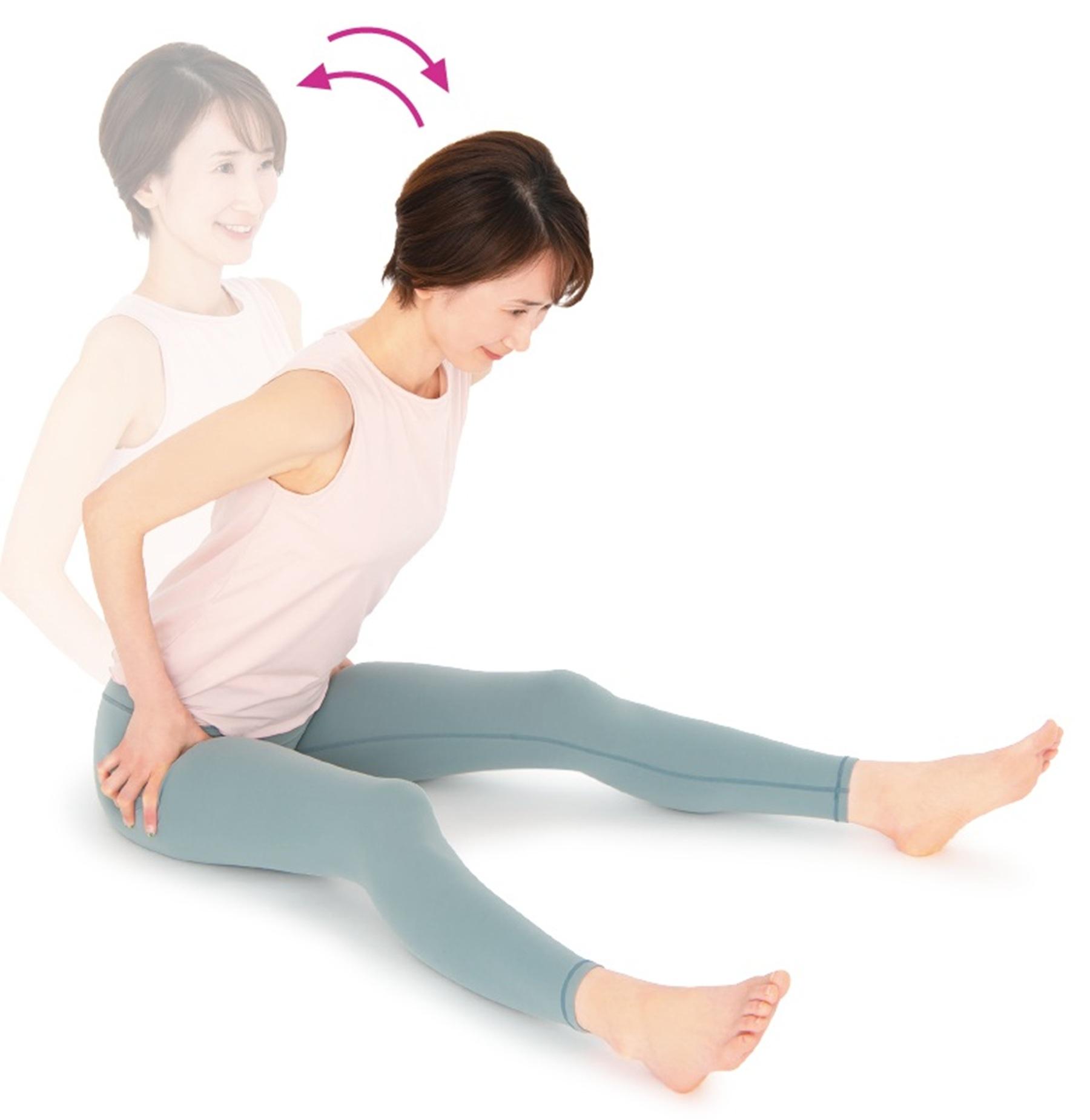 脚を伸ばし、股関節に両手を当てる。この時、親指が内側、他の指が外側に向くようにする。そのまま上半身をゆっくりと前に倒して起こす動作を5回を目安に繰り返す。脚をまっすぐ伸ばすことがつらい人は、膝を少し曲げてもOK。