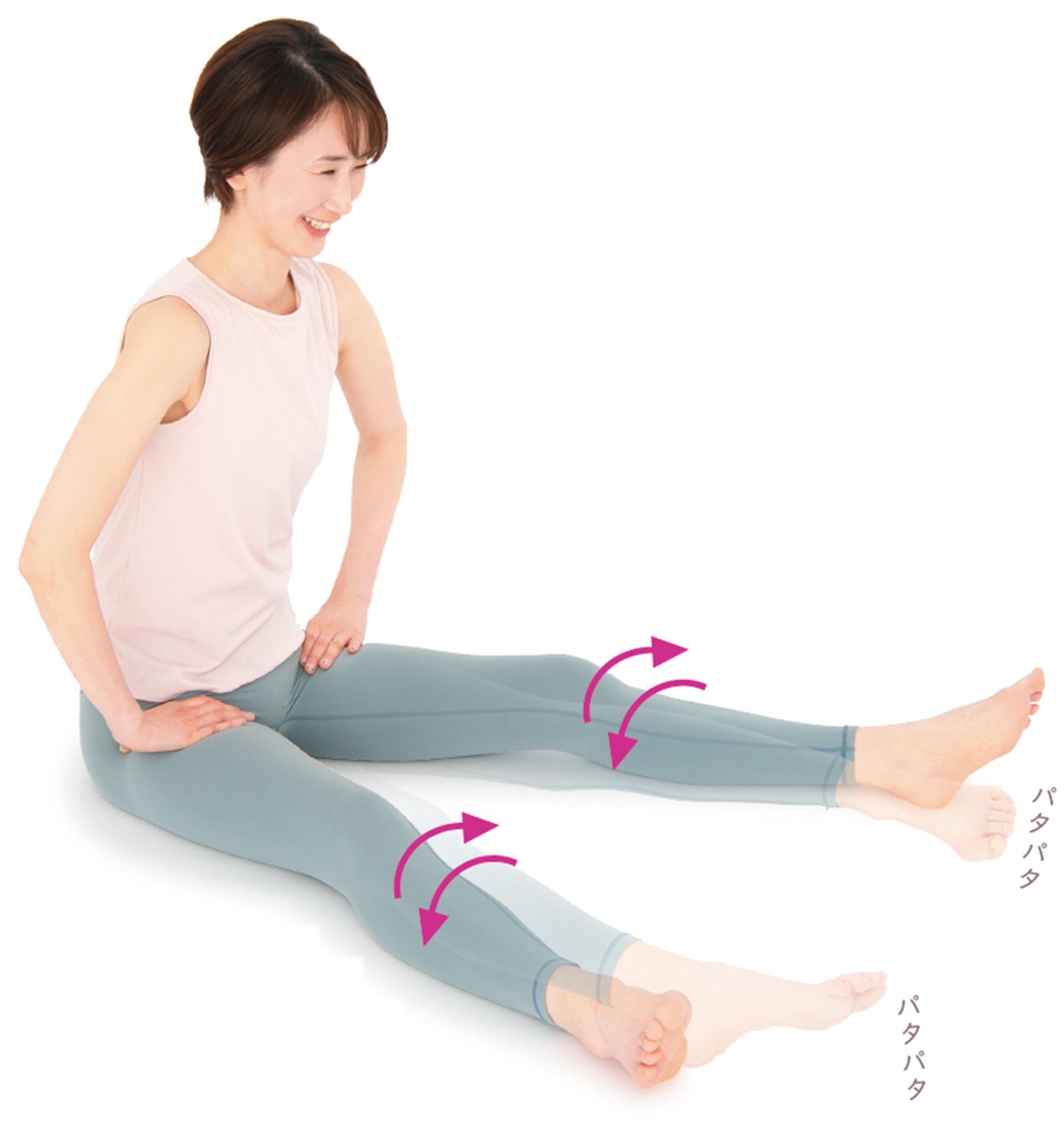 膝を伸ばして座った状態のまま、脚を内側外側と、左右にパタパタと動かす。20回を目安に行って。脚全体の緊張が緩まり、デトックス効果に加えて、体の血流や巡りがアップすることにもつながる。
