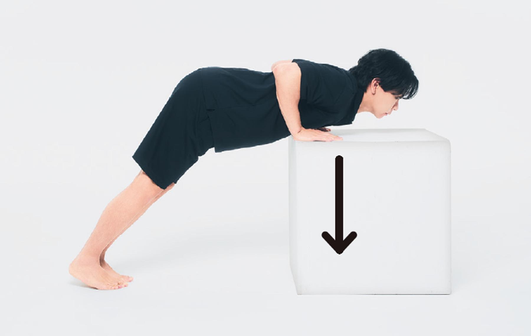 2、肩甲骨を寄せつつゆっくりと上半身を下ろしたら、台を下に押しながら元の体勢に。肘を曲げた時に手が胸より上にきてしまうと、肩を痛めるので注意。