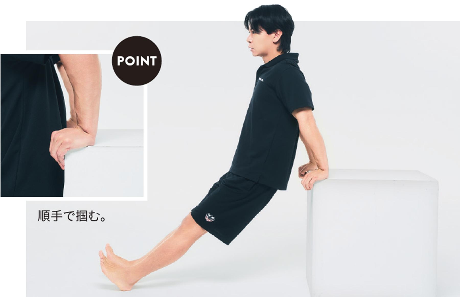 1、台を背にして肩幅に開いた両手を縁に置き、脚を前に伸ばす。手のひらの下部を使うため、手全体をベッタリ置くのではなく縁を軽く掴むイメージが正解。