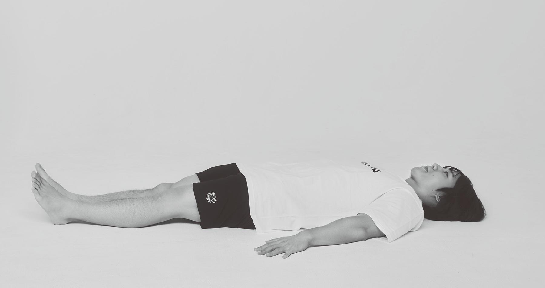 仰向けの状態で腕を軽く広げ、手のひらをベッドにつけて上半身を固定する。脚は真っすぐに揃えて。