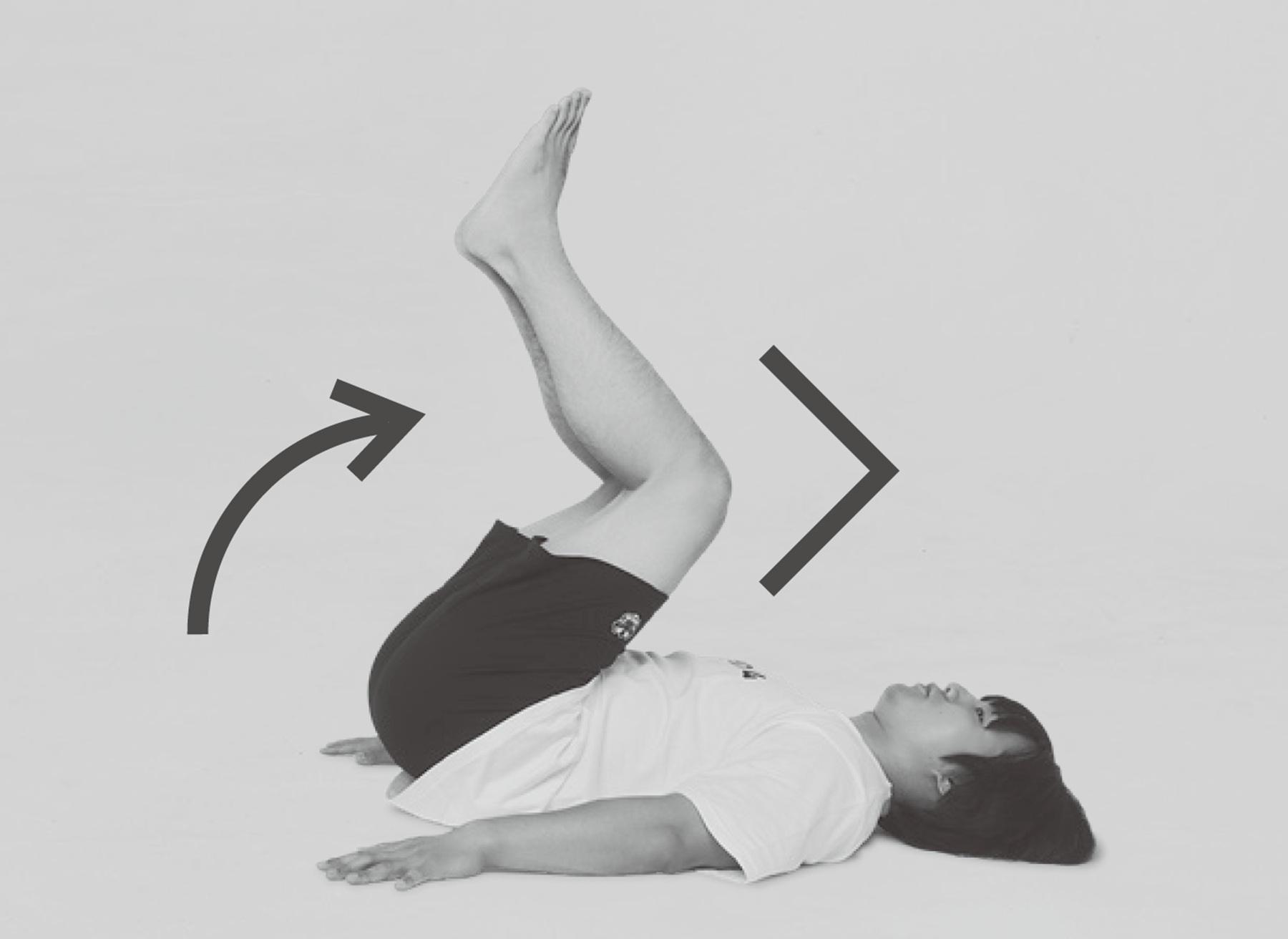 90度以上脚を持ち上げてお尻をベッドから浮かせたら、両脚のかかとがベッドにギリギリつかないところまで下ろす。