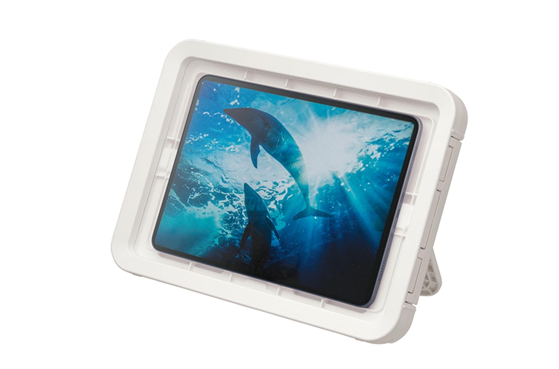 高い防水性能で、浴室内でも安心して使用できるタブレット用防水ケース。マグネット式で浴室の壁にケースごとピタッとくっつき、4段階に角度調整も可能。「ケースの上から指で操作できるからストレスフリーな使い心地。スタンド付きなのでキッチンなどさまざまな場面で使えます」(神原さん)。¥3,980*編集部調べ(リズム)