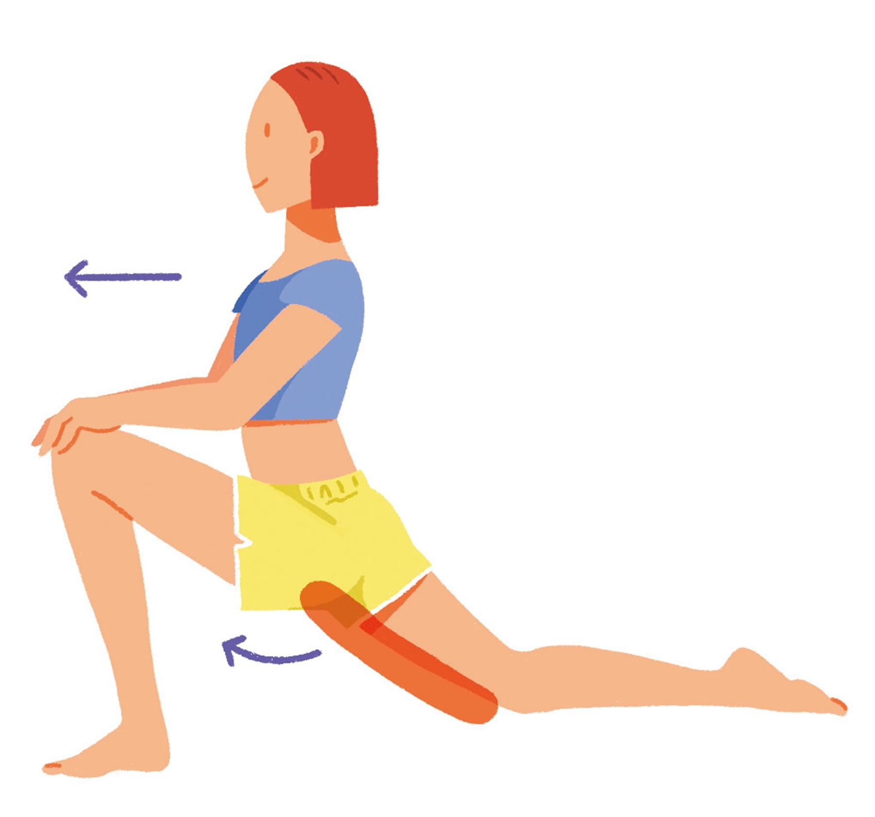 ひざ立ちになり片方の脚を前に出す。後ろの脚はそけい部から太ももまでがしっかり伸びていることを確認し、足の甲は床につけて10秒キープ。反対側の脚も同様に。