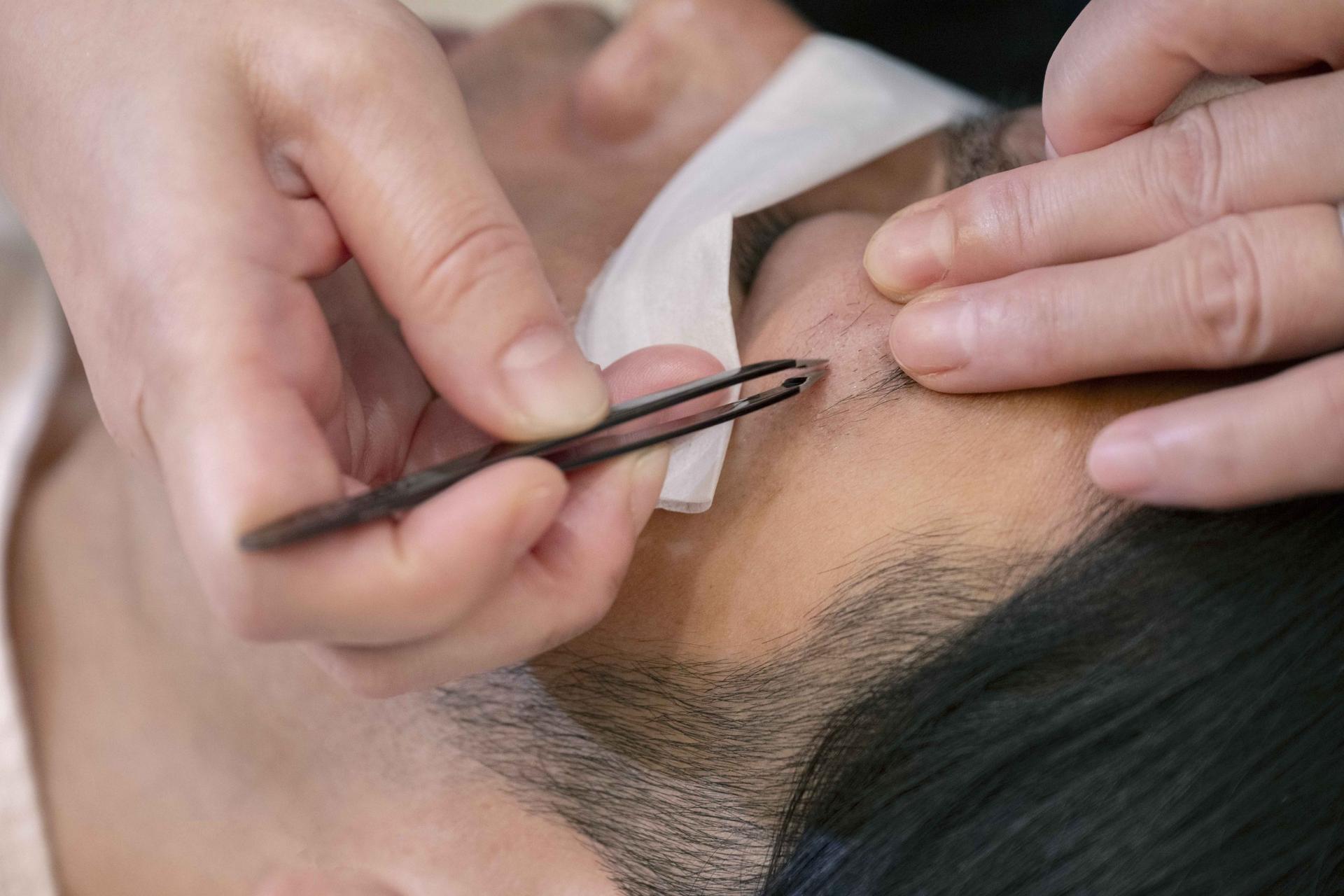 超早技の手捌きで、毛抜きでも眉まわりの不要な毛を処理していく。