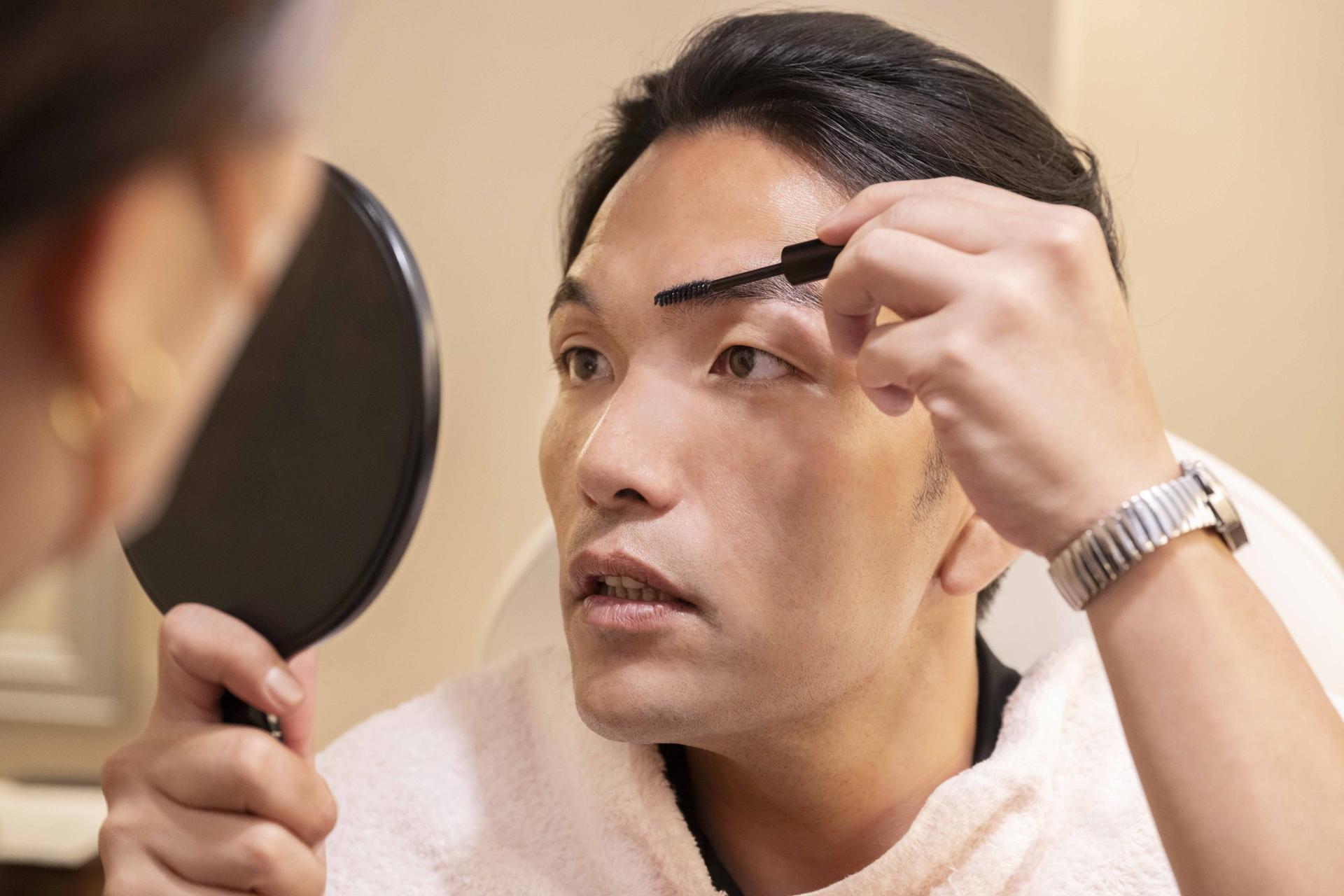 眉毛の量が多く、描かなくても形が決まる盛山さん。アイブロウジェルでのスタイリング方法を学ぶ。