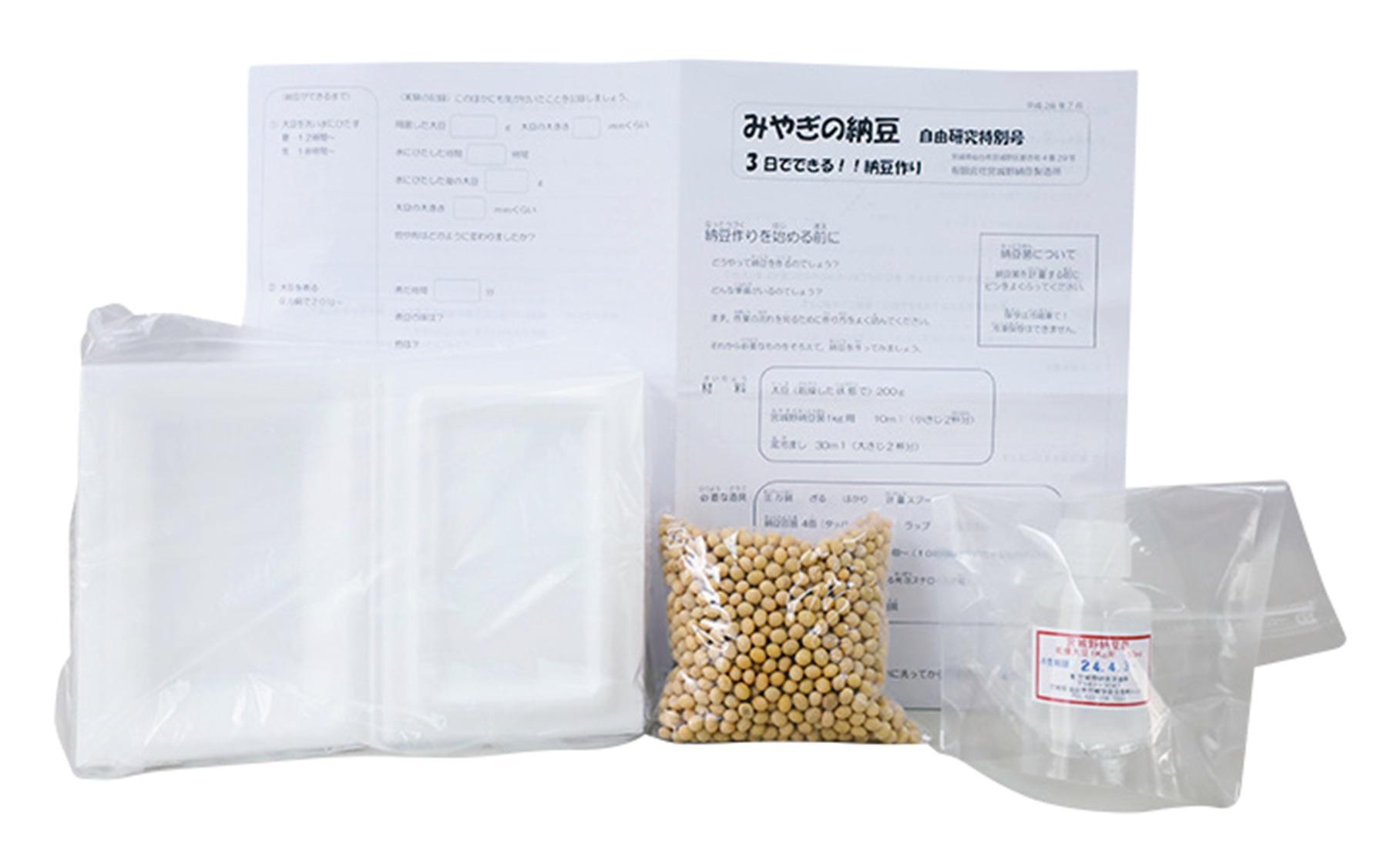 大豆200g、納豆菌(1kg用1本)、納豆容器4個入り ¥1,080(宮城野納豆 TEL. 022-256-7223)