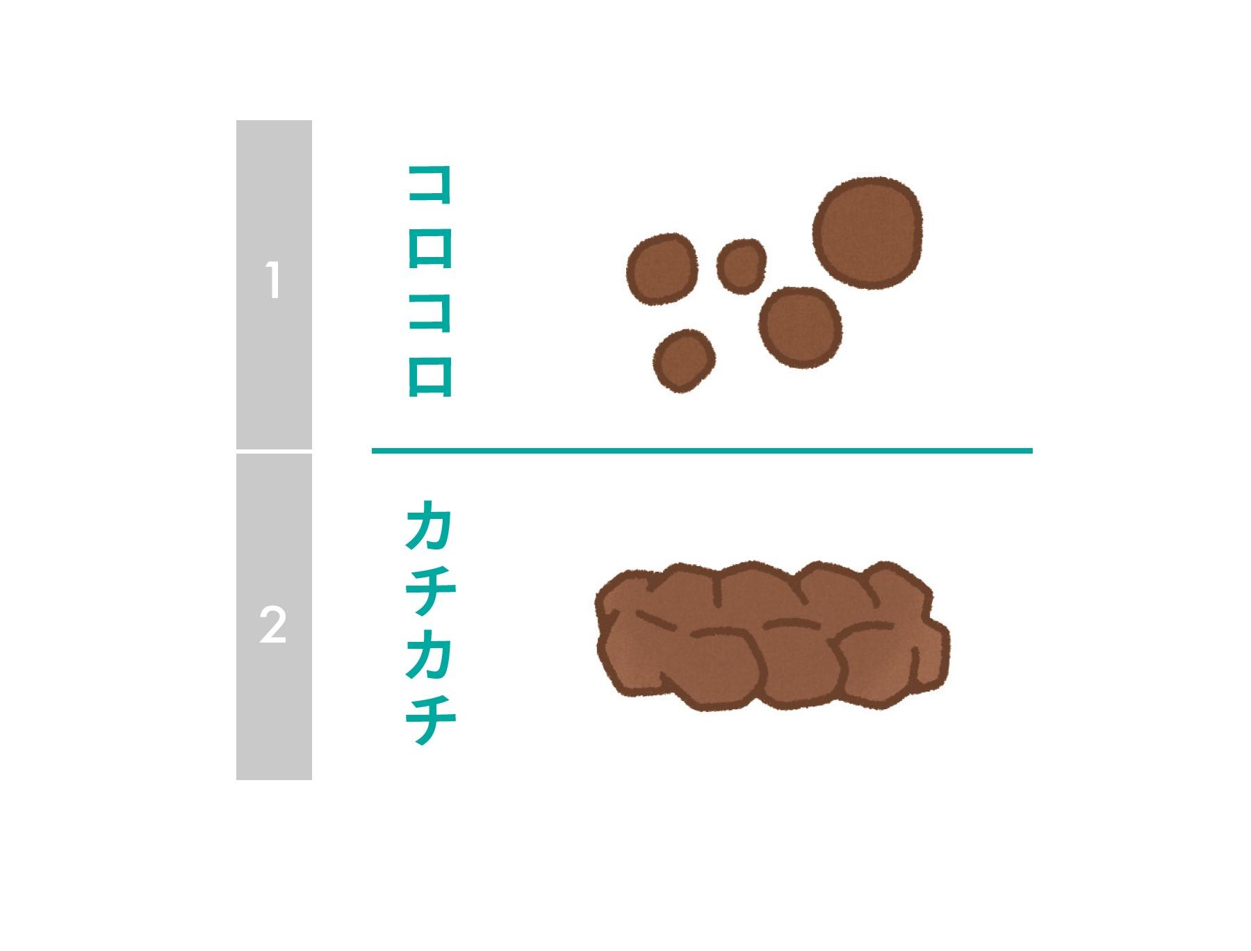 ウサギの糞のように硬くてコロコロ。腸が動いていない状態。胃腸の負担を減らすよう、食事はよく噛むこと。こまめに水分補給を。
