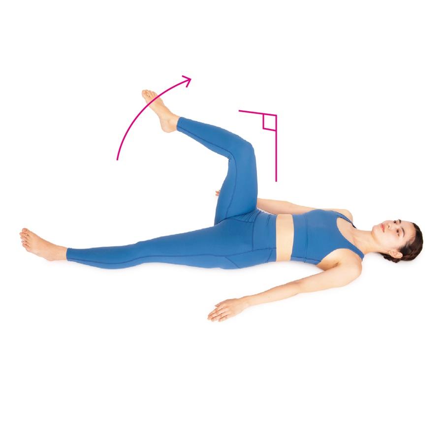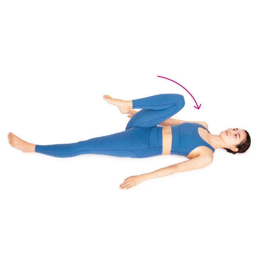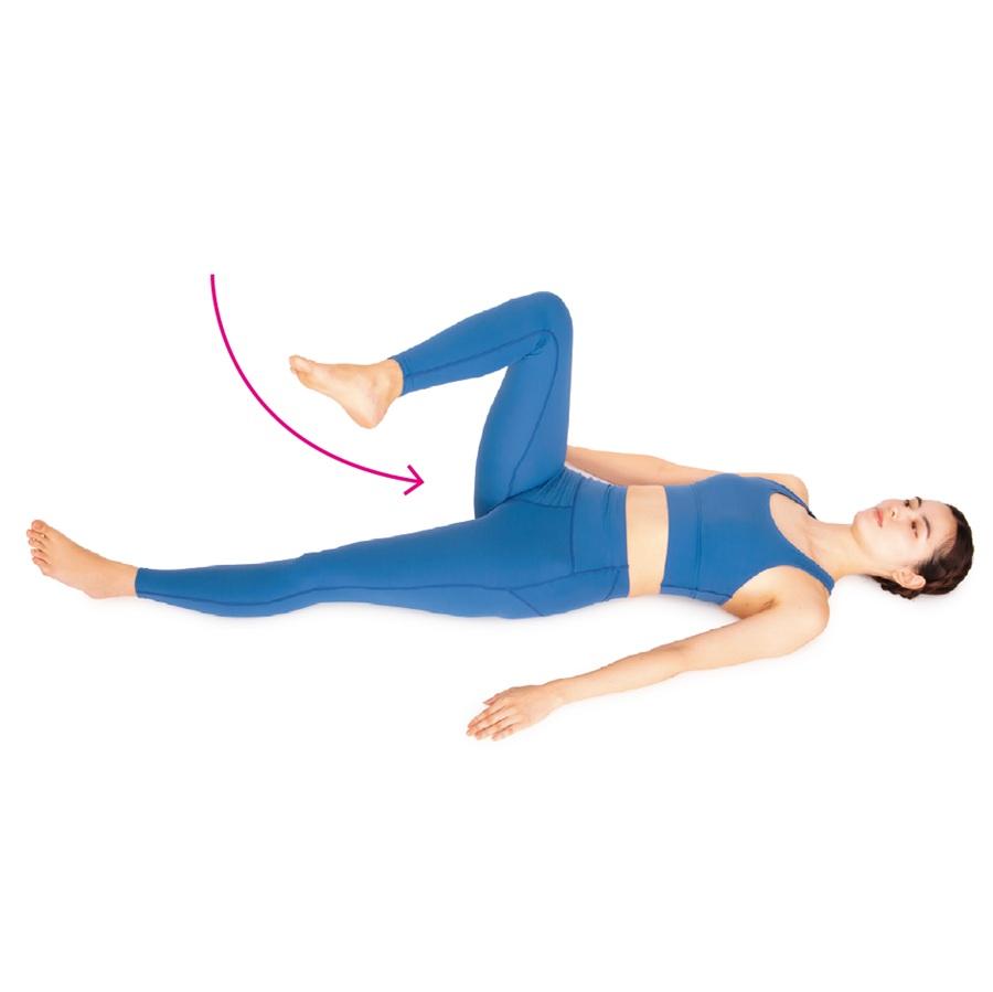 ひざを引き寄せて股関節の屈曲筋群を最大限に収縮させてから、つま先を外側と内側に交互に振って回旋の可動域を広げる動き。股関節と連動して動く骨盤の傾きも整いやすい。