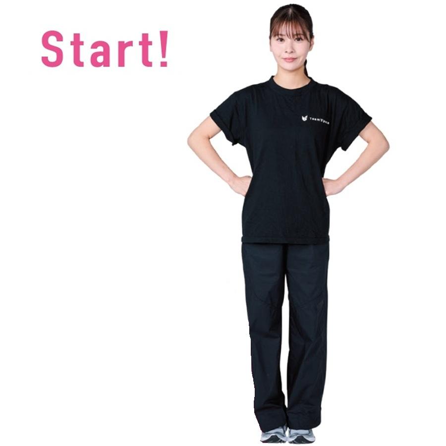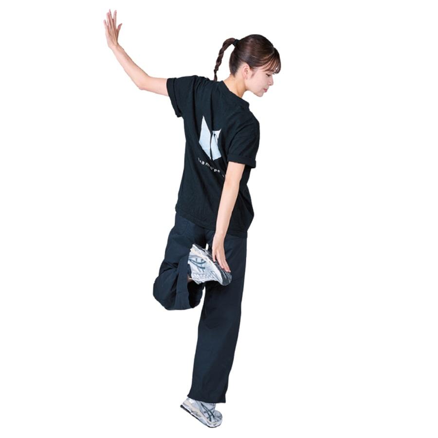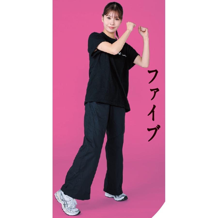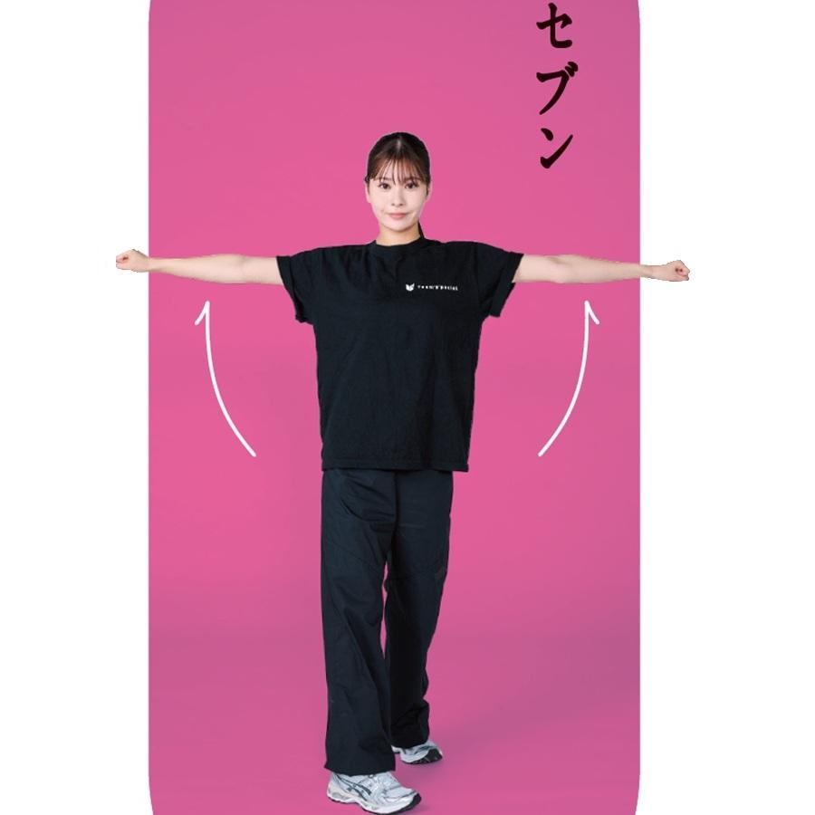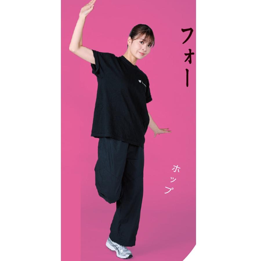 一連の動き中、かかとをUP&DOWNさせ軽やかにバウンスする全身運動を。動きをマスターしたらBPMを上げてみて。