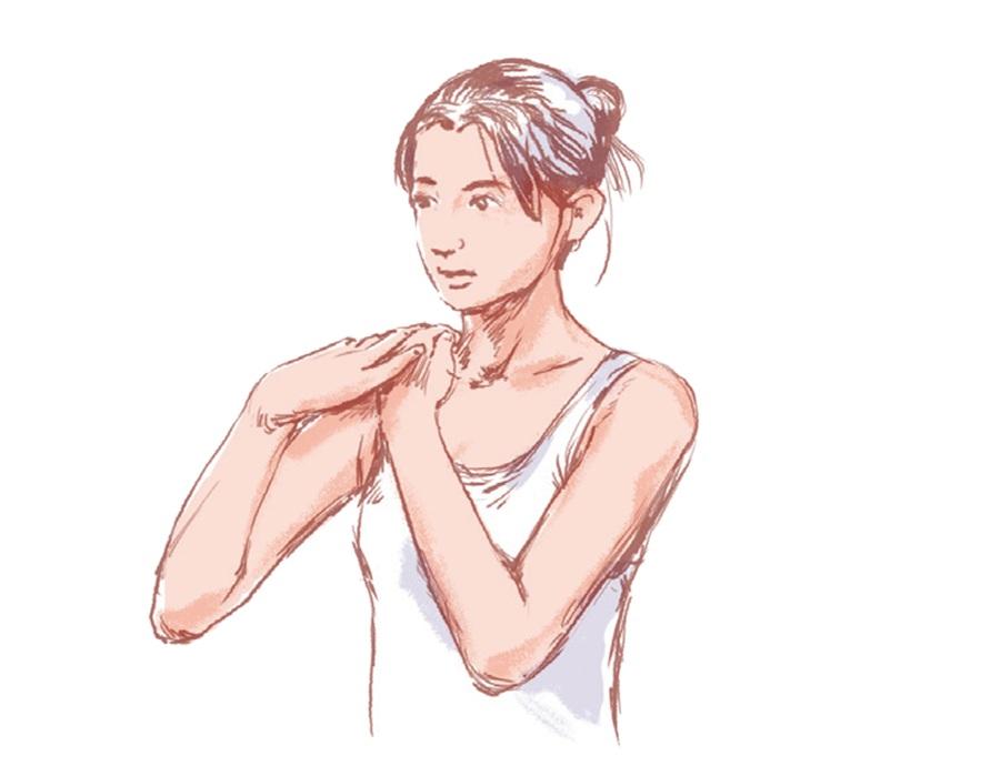 左右各30~40回。肩に置いた指が、肩が上がるのを防ぐストッパーとなり、効果を高める。筋肉が固まっていてこの動きがツラい人は、両腕を同時に後ろに回すだけでもOK。その際も、手のひらは上向きに。