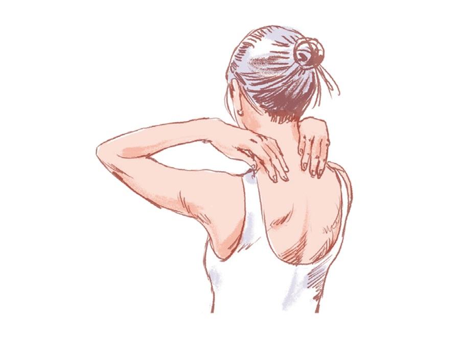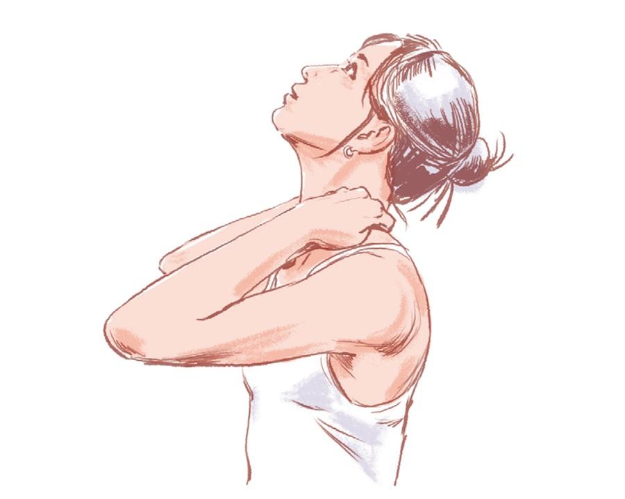 簡単なエクササイズの前にやっておくと、動かしやすくなるマッサージをご紹介。首の後ろに溜まった脂肪を柔らかくして、血流を促そう。どれも、40秒間押さえるだけで、肩が下がるのが実感できるはず。