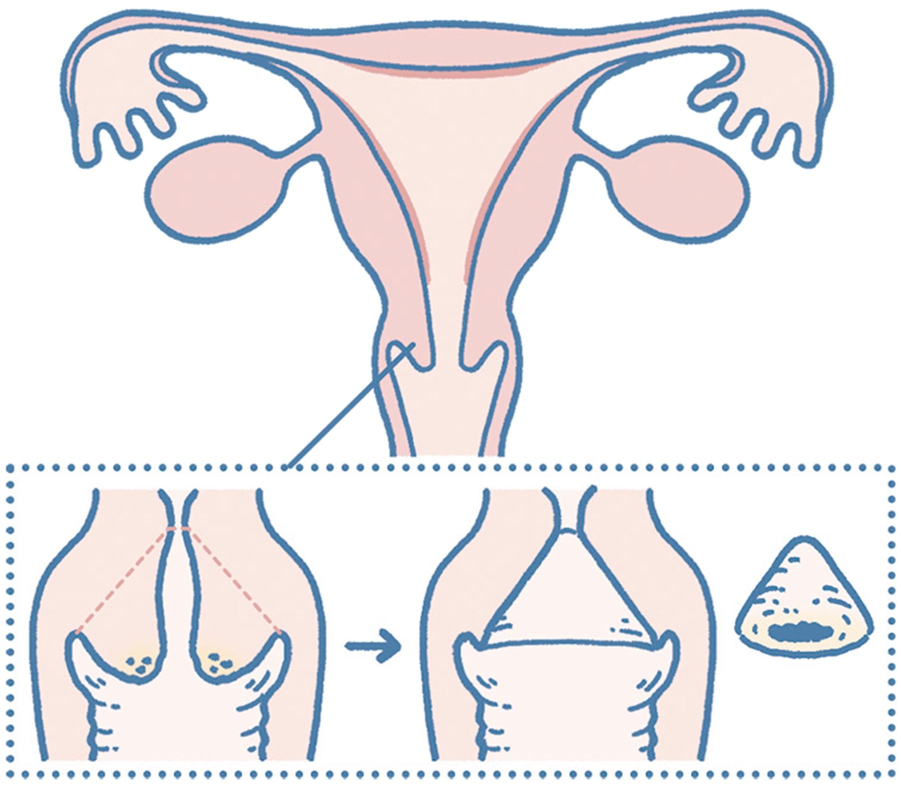 手術として代表的なのが、下の図のように子宮頸部を円錐型に切り取る「円錐切除」。他には炭酸ガスを用いたレーザーで患部を焼く方法もあり、どちらも子宮を温存できるのでその後の妊娠・出産が可能で、処置は膣から行うのでお腹に手術痕が残らない。
