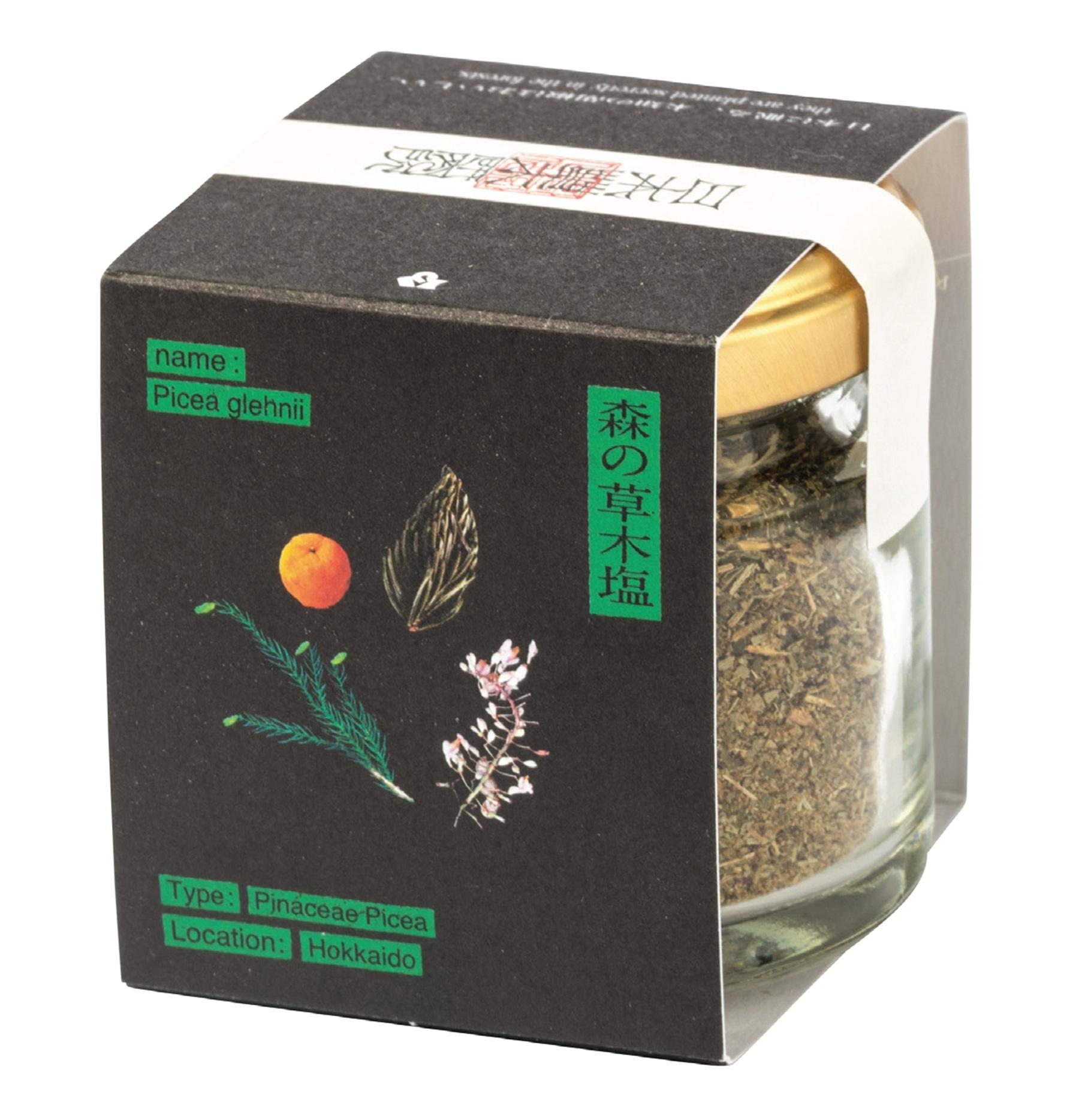 月桃の葉、杉の新芽、ヨモギの花、柚子皮、山椒の葉などを使った美味なるハーブソルト。手がけたのは、森の多様性を守るため、全国の里山に眠る植物の“食材としての可能性”を発掘するという思いから立ち上げた「日本草木研究所」です。